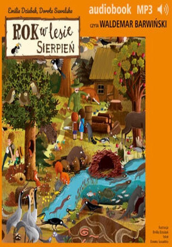 Bestsellerowa książka Emilii Dziubak teraz także do słuchania – z odgłosami lasu i wyjątkowym narratorem! W sierpniowym lesie dziki zażywają kąpieli błotnych, a wiewiórki szukają chłodnej wody do picia. Nie każdemu jednak przeszkadza upał. Łosie są zbyt zajęte, by o nim myśleć, bo właśnie walczą o względy uroczej klępy… „Rok w lesie. Sierpień” to ósmy odcinek z cyklu dwunastu opowieści stworzonych przez Dorotę Suwalską na podstawie bestsellerowej książki Emilii Dziubak. Podczas słuchania historii opowiadanych przez wyjątkowego narratora – jest nim dąb, któremu głosu użyczył Waldemar Barwiński – możesz uważnie oglądać „Rok w lesie”, bo teksty audiobooka idealnie pasują do ilustracji. W nagraniu usłyszysz też realistyczne odgłosy zwierząt, które przeniosą cię w sam środek letniego lasu. Pozwól, by las opowiedział ci o tym, co dzieje się w sierpniu między drzewami. Słuchaj w domu, w przedszkolu, w podróży lub przed snem. Dorota Suwalska – pisarka, animatorka kultury, ilustratorka, dziennikarka, autorka scenariuszy. Nominowana do Astrid Lindgren Memorial Award 2013 i 2014. Współpracowała z TVP, realizując krótkie filmy plastyczne i felietony autorskie dla dzieci. W swoim dorobku ma trzy tomiki poetyckie oraz powieści dla dzieci i młodzieży: „Znowu kręcisz, Zuźka!", „Zuźka w necie i w realu", „Bruno i siostry" (wyróżnienie literackie w konkursie Polskiej Sekcji IBBY Książka Roku, nominacja do nagrody Kornela Makuszyńskiego, powieść na liście książek proponowanych przez Polski Instytut Książki), „Marionetki Baby-Jagi", „Ratunku, marzenia!", „Pan Fortepianek". Jej utwory tłumaczone były na hiszpański, słoweński, a także... na język przestrzeni. To ostatnie dotyczy literacko-internetowego projektu: „a" (dla dorosłych). Swoje wiersze, opowiadania i artykuły publikowała w prasie dziecięcej, literackiej i pedagogicznej, podręcznikach szkolnych. Współpracuje z portalem Emilia Dziubak – autorka i ilustratorka książek dla dzieci. Absolwentka Akademii Sztuk Pięknych w Poznaniu. Współpracuje z autorami i wydawnictwami w Polsce i za granicą. Laureatka Nagrody Literackiej . Warszawy w 2014 r. Laureatka nagrody „Przecinek i Kropka” w konkursie na najlepszą książkę dziecięcą w 2016 r. Wyróżniona w 2016 r. w konkursie PTWK Najpiękniejsze Książki Roku 2015 za autorską książkę „Rok w lesie”. Laureatka nagrody „Żółta Ciżemka” w 2017 r. W 2018 r. wyróżniona w konkursie Książka Roku Polskiej Sekcji IBBY. Laureatka nagrody Soligatto 2019. Powyższy opis pochodzi od wydawcy