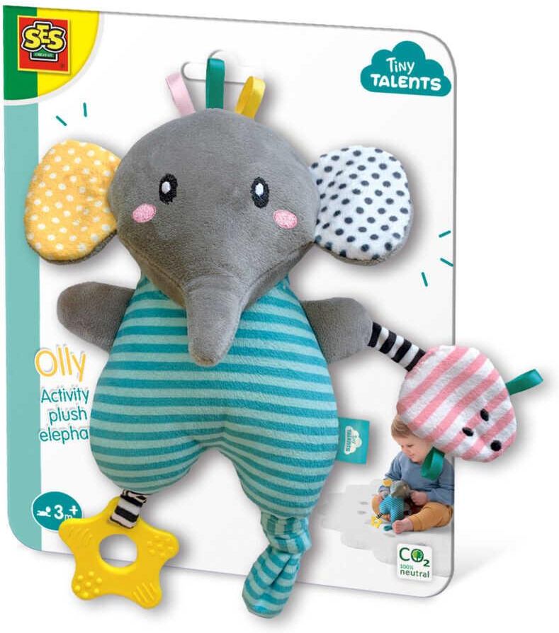 Olly to nowy przyjaciel Twojego dziecka. Miękkie tkaniny, różnorodne faktury i szeleszczące elementy pobudzą rozwój maluszka. Przyczepiona do nóżki słonia gwiazdka sprawdzi się podczas ząbkowania a grzechotka umieszczona w brzuszku zaciekawi dziecko. Olly to idealny towarzysz niemowląt po 3 miesiącu życia.