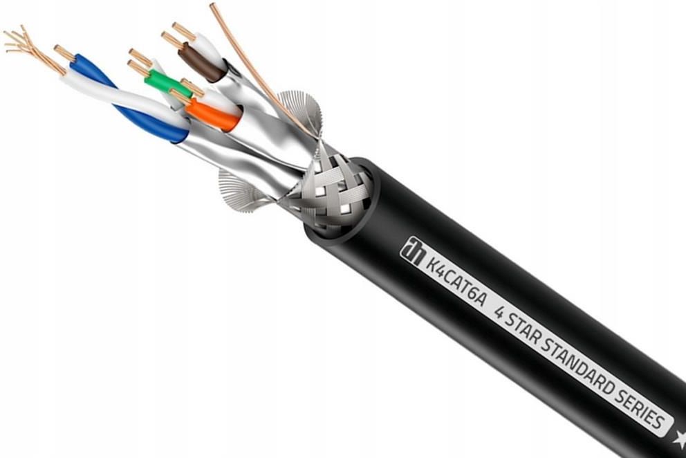 Adam Hall 4 STAR N CAT 6 Network Cable Cat.6a (S/FTP) skrętka ethernetDzięki częstotliwości transmisji wynoszącej 500 MHz, którą osiągnięto dzięki specjalnej izolacji przeciwległych par przewodów, kat. 6a jest obecnie najczęściej stosowanym kablem sieciowym. najbardziej popularny kabel sieciowy. Wysokiej jakości kabel K4 N CAT6 z serii 4 Star występuje w wersji z czterema skrętkami i jest naszym standardowym kablem do zastosowań sieciowych wewnątrz i na zewnątrz budynków. Dzięki temu można go zainstalować we wszystkich obszarach zastosowania istotnych z punktu widzenia event- tech. Kat.6a jest kompatybilna w dół i dlatego może być używana również do transmisji kat.6 i kat.5e. Nasze profesjonalne kable sieciowe Cat.6a spełniają wszystkie wymagania branży event tech i charakteryzują się wytrzymałością do zastosowań zewnętrznych lub trwałością do zastosowań studyjnych. K4 N CAT6 może być używany do transmisji na odległość do 70 m Dane techniczne: Rodzaj produktu: Kable na metry Typ: Kabel instalacyjny, Kable sieciowe Kolor: Czarny Średnica kabla: 10,0 mm AWG: 24 Przekrój przewodu wewnętrznego: 4 x 2 x 0,22 mm² Budowa przewodu wewnętrznego: 7 x 0,2 mm Ekranowanie: Ekran pleciony 128 x 0,12 m Materiał ekranowania: AL / PT Folia z oplotem Zakres temperatur: - 20 - 60 °C