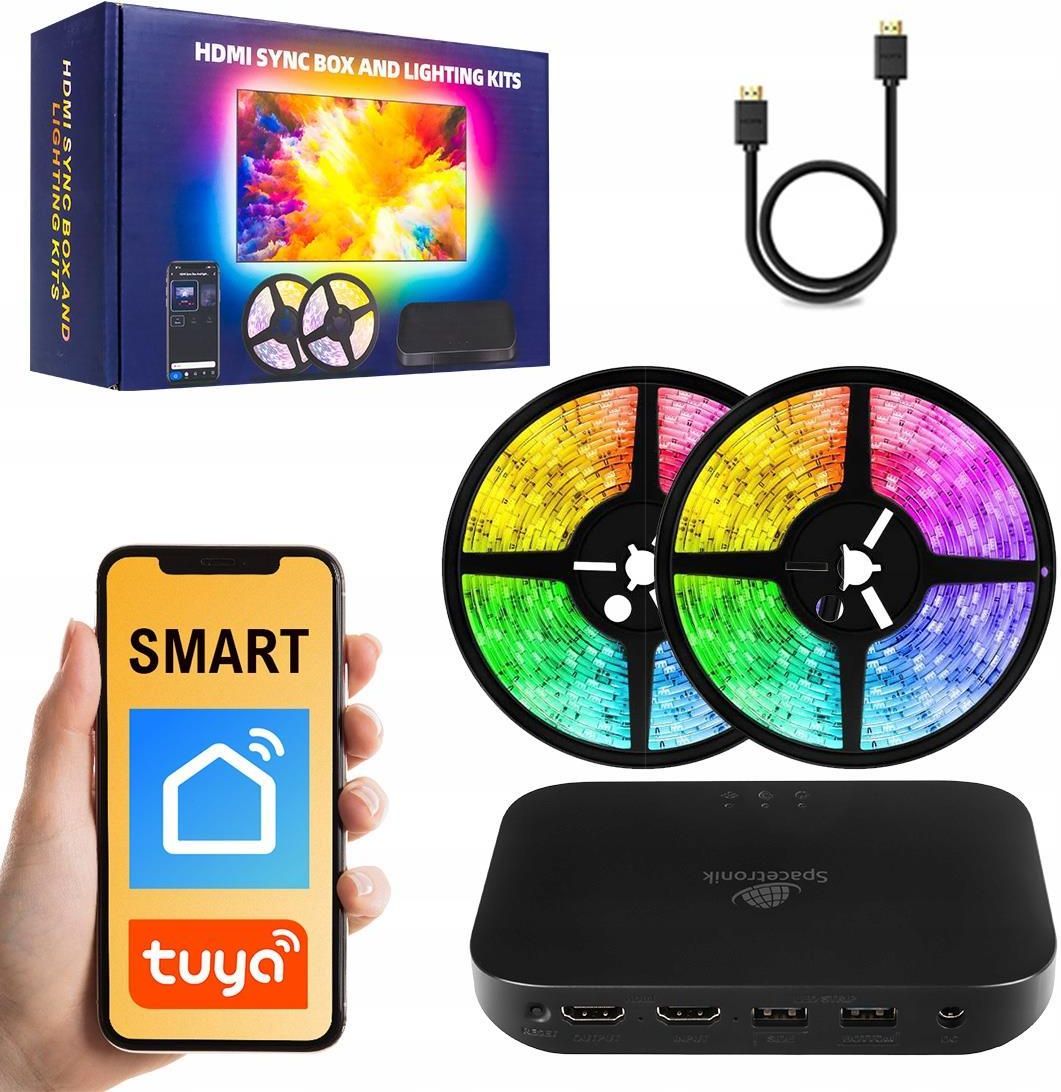 Inteligentne podświetlenie telewizora Spacetronik Glow HDMIRozbuduj swoje kino domowe i spraw, by światła tańczyły, migały, przyciemniały i rozjaśniały się wraz z zawartością ekranu. Spacetronik Glow HDMI to urządzenie z taśmami LED, które uatrakcyjni oglądanie telewizora. Zamontuj taśmę LED za telewizorem i zyskaj zaawansowane podświetlenie TV sterowane inteligentnym urządzeniem HDMI bez żadnych dodatków, kamer i innych detektorów montowanych na krawędzi telewizora. Steruj zdalnie za pomocą smartfona i dostosuj podświetlenie telewizora wg własnych preferencji. Inteligentne podświetlenie przez HDMISpacetronik Glow HDMI to inteligentne urządzenie, które wprowadzi wyjątkową atmosferę podczas seansu filmowego w domu. Paski LED o dł. 3,8 m dzięki diodom wysokiej jakości wyświetlają światło w wielobarwnych kompozycjach i zróżnicowanych trybach w nieograniczonej 16-milionowej palecie kolorów. Synchronizacja podświetlenia odbywa się w sposób cyfrowy, tj. jest przetwarzana przez zaawansowane urządzenie Spacetronik Glow HDMI. Urządzenie nie może być używane ze wbudowaną aplikacją na Smart TV - wymagane jest wykorzystanie urządzenie wejsciowego HDMI, np. laptopa lub konsoli. Urządzenie dopasuje podświetlenie do treści telewizora i dźwięku Obsługa różnych źródeł sygnału, m.in. dekodery, konsole do gier, Blu-Ray HDMI 1.4/2.0b z rozdzielczością wideo do 4K 60 Hz HDCP 2.2 HDR10+ Dolby Vision Łatwy i szybki montaż Długość taśm ledowych 3,8 m 16 mln żywych kolorów Zmiana koloru w rytm muzyki Zdalne sterowanie smartfonemOświetlenie TV Spacetronik Glow HDMI jest zarządzane poprzez popularną darmową aplikację mobilną Tuya Smart (dostępna dla iOS & Android). Dostosuj ustawienia światła takie jak jasność, kolor, scenę. Sterowanie działa w oparciu o sieć Wi-Fi 2,4 GHz. Synchronizacja podświetlenia z dźwiękiem i obrazemDzięki zastosowanej technologii zainstalowane podświetlenie telewizora będzie zsynchronizowane z zawartością wyświetlają na ekranie TV. Urządzenie posiada 44 tryby dynamiczne oraz 6 trybów do synchronizacji z muzyką. Spacetronik Glow HDMI obsługuje różne źródła HDMI - podłącz swoją konsolę Xbox, Playstation, laptopa, Apple TV i wiele więcej urządzeń. Sterowanie głosoweSteruj inteligentnym podświetleniem telewizora Spacetornik Glow HDMI za pomocą swojego głosu. Nie podnoś się z fotela i wydawaj polecenia wokalne, które sprawią, że podświetlenie TV włączy się, przyciemni, rozjaśni, zmieni barwę itp. Kontrola głosowa odbywa się za pomocą Amazon Alexa lub Asystenta Google. RGB czyli 16 milionów kolorówTechnologia RGB pozwala wyświetlać aż 16 mln kolorów w różnych wielobarwnych kombinacjach. Łatwy i szybki montażDzięki elastycznej konstrukcji taśmy LED 3,8 m, łatwo możesz ją dopasować do telewizorów i monitorów. Przyklej, podłącz zasilanie i rozświetl tło za telewizorem. Kompatybilne z urządzeniami wyświetlającymi o przekątnej 32-65 cali. Oświetlenie telewizora Spacetronik Glow HDMI - Specyfikacja technicznaDane techniczne- Napięcie wejściowe: DC12V - Zasilanie: sieciowe 230V - Sterowanie: Aplikacja Tuya Smart + sterowanie głosowe (wymagany Amazon Alexa lub Google Assistant) - Łączność: Wi-Fi 2,4GHz - Dla telewizorów i monitorów 32-65 cali - Kompatybilność z różnymi urządzeniami wejściowymi HDMI - Urządzenie nie może być używane z wbudowaną aplikacją na Smart TV - wymagane jest wykorzystanie urządzenie wejsciowego HDMIZawartość zestawu- 2x taśma LED - 1x Instrukcja obsługi - 1x Zasilacz sieciowy 1,5 m - 1x Urządzenie Spacetronik Glow HDMI - 1x Kabel HDMI 1 m