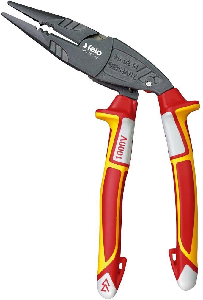 Szczypce półokrągłe łamane izolowane VDE FELO długość 200 mm Z funkcją usuwania izolacji z przewodów jedno- i wielożyłowych o przekroju przewodu 1.5 mm² i 2.5 mm² Do cięcia twardych i miękkich drutów Krawędzie tnące hartowane indukcyjnie Ząbkowanie wewnątrz szczęk Ergonomiczna, kątowa główka Zintegrowany klucz oczkowy Ze sprężyną rozwierającą i zatrzaskiem Przeniesienie mocy z optymalną dźwignią zapewnia łatwą i niewymagającą wysiłku pracę Wielokomponentowa, ergonomicznie ukształtowana rękojeść SoftGripp zgodna z DIN EN/IEC 60900 Uchwyty SoftGripp z SystemSocket przeznaczonym do mocowania opcjonalnie dostępnych akcesoriów, np. smyczy SystemClip zapobiegających upadkowi narzędzia z wysokości Ergonomiczna konstrukcja szczypiec zmniejsza zmęczenie pracą, a także chroni ścięgna i stawy użytkownika Wykonane ze stali narzędziowej, kutej, hartowanej w oleju Firma FELO jest niemieckim przedsiębiorstwem, którego tradycje sięgają roku 1887. Na przestrzeni blisko 140 lat swojej działalności zasłynęła z wielu innowacyjnych projektów oraz patentów technicznych m.in. dwuskładnikowej rękojeści, nowoczesnego szafirowo-diamentowego bita czy systemu Smart. Obecnie zajmuje pozycję wiodącego na świecie producenta najwyższej jakości wkrętaków oraz bitów.Wkrętaki Felo charakteryzują się niezwykle dużą precyzją wykonania końcówek jak również trwałością. Zdolne są przenosić najwyższe momenty obrotowe, a tym samym spełnić wysokie wymagania wszystkich znanych norm technicznych. Ich rękojeści są ukształtowane w sposób niespotykanie ergonomiczny – umożliwiają pewny chwyt oraz minimalny wysiłek przy pracy. Dodatkowo rękojeści wyposażone są w poprzeczny otwór mogący służyć jako zawieszka lub też można go wykorzystać do włożenia dźwigni ułatwiającej przykręcanie/odkręcenie śruby.