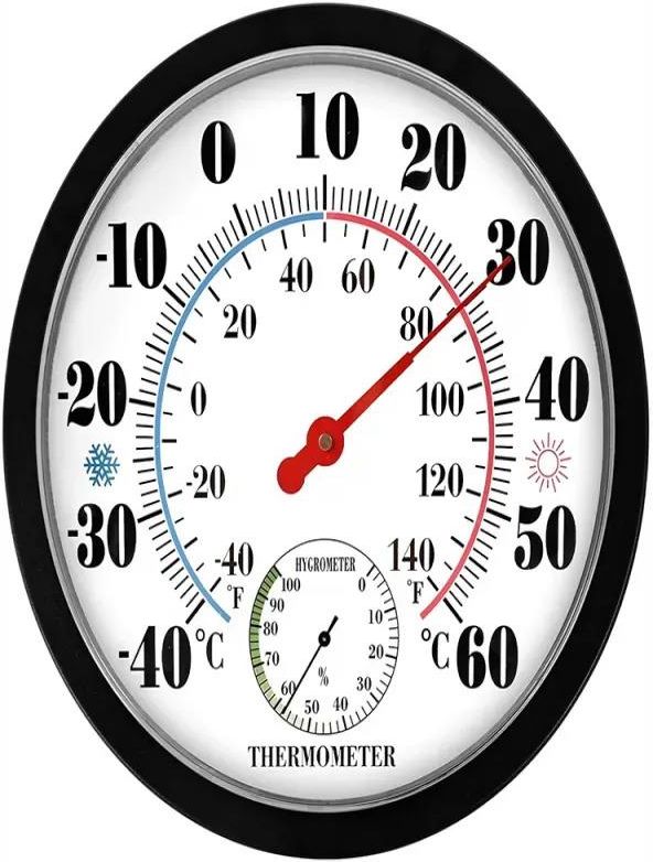 Termometr pozwala w prosty sposób kontrolować temperaturę oraz wilgotność powietrza w pomieszczeniu. Dzięki dużej, wyraźnej tarczy wszystkie wartości są łatwe do odczytania nawet z większej odległości. Możliwość zawieszenia na ścianie pozwala wygodnie zamontować termometr w wybranym miejscu. Urządzenie nie wymaga baterii, ponieważ posiada wbudowany czujnik temperatury i wilgotności, który automatycznie wykrywa zmiany w otoczeniu i dokonuje pomiaru. Wyraźna i czytelna skala pomiarowa umożliwia szybkie sprawdzenie temperatury w stopniach Celsjusza i Fahrenheita oraz wilgotności powietrza. Duże oznaczenia liczbowe oraz kontrastowe wskazówki sprawiają, że odczyt jest bardzo wygodny nawet z dalszej części pomieszczenia. SPECYFIKACJA TECHNICZNA Wysoka jakość wykonania Materiał: tworzywo sztuczne Zakres pomiaru temperatury: od -40°C do +60°C Zakres pomiaru wilgotności: 0%-100% rh Możliwe zawieszenie na ścianie Wymiary Szerokość: 2.2 cm Średnica: 25 cm Kolor: czarny Zasilenie: nie wymaga baterii Zastosowanie: do domu, kuchni, biura, garażu, warsztatu, na balkon lub taras ZESTAW ZAWIERA Fabrycznie nowy termometr Oryginalne opakowanie Urządzenie doskonale sprawdzi się w domu, kuchni, salonie, biurze, garażu czy na tarasie.