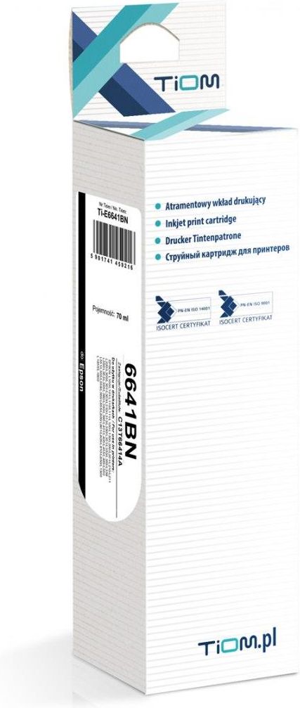 Zamiennik tuszu Epson T6641 Czarny marki TiOM - Wydajność i oszczędność w codziennym drukowaniu Tusz Epson T6641 Czarny Zamiennik - Ekonomiczne rozwiązanie dla Twojej drukarki EcoTank Zamiennik tuszu Epson T6641 czarny marki TiOM to produkt zaprojektowany z myślą o użytkownikach, którzy szukają efektywnego rozwiązania dla swoich drukarek ze stałym zasilaniem atramentem. Jest to atrament w butelce, idealny do napełniania zbiorników drukarek Epson, oferujący doskonałe połączenie wysokiej wydajności i niskich kosztów eksploatacji. TiOM to ekonomiczna marka, która dostarcza tanie, ale funkcjonalne tusze, dedykowane użytkownikom ceniącym oszczędność przy zachowaniu odpowiedniej jakości wydruków. Wysoka jakość w niskiej cenie - Zamiennik tuszu Epson T6641 Tusz Epson T6641 zamiennik marki TiOM to propozycja dla tych, którzy potrzebują taniego tuszu, który zapewni odpowiednią jakość druku na co dzień. Dzięki pojemności 70 ml, tusz ten idealnie nadaje się do codziennych zadań biurowych oraz domowych. Jest to idealne rozwiązanie dla osób, które drukują duże ilości dokumentów, ale jednocześnie nie chcą przepłacać za materiały eksploatacyjne. Zamiennik TiOM zapewnia solidne rezultaty druku, przy jednoczesnym znacznym obniżeniu kosztów każdej wydrukowanej strony. Nowy, fabrycznie wykonany zamiennik z gwarancją Zamiennik tuszu Epson T6641 marki TiOM to nowy, fabrycznie wykonany produkt, co oznacza, że nie jest on regenerowany. Produkt ten został zaprojektowany od podstaw z nowych materiałów, co zapewnia pełną kompatybilność z drukarkami Epson oraz bezpieczeństwo użytkowania. Zamiennik objęty jest 12-miesięczną gwarancją Producenta, a jego jakość została potwierdzona w testach wydajnościowych zgodnych z normami ISO 19752. Certyfikaty ISO oraz TUV M+T stanowią gwarancję, że tusz ten spełnia najwyższe standardy jakości. Dlaczego warto wybrać zamiennik tuszu Epson T6641 marki TiOM? Oszczędność: Zamiennik TiOM pozwala znacząco obniżyć koszty drukowania, oferując tani tusz o rozsądnej jakości. Nowy produkt: Tusz jest fabrycznie wykonany od podstaw, co zapewnia jego niezawodność i długotrwałą eksploatację. Bezpieczeństwo: Zamiennik Epson T6641 jest w pełni kompatybilny z drukarkami Epson i przetestowany zgodnie z normami ISO oraz TUV M+T. Wydajność: Pojemność 70 ml gwarantuje długie użytkowanie, co zmniejsza potrzebę częstego uzupełniania tuszu. Gwarancja: Produkt jest objęty 12-miesięczną gwarancją Producenta, co zapewnia użytkownikowi pełne wsparcie i pewność działania. Kompatybilność z drukarkami Epson Zamiennik tuszu Epson T6641 czarny marki TiOM jest kompatybilny z szeroką gamą drukarek Epson, w tym: Epson Expression ET-2500 Series Epson L 100 Epson L 200 Epson L 355 Epson EcoTank Series: Epson EcoTank ET-2500 Epson EcoTank ET-2500 Series Epson EcoTank ET-2550 Epson EcoTank ET-2600 Epson EcoTank ET-2600 Series Epson EcoTank ET-2650 Epson EcoTank ET-3600 Epson EcoTank ET-4500 Epson EcoTank ET-4550 Epson EcoTank ET-14000 Epson EcoTank ET-16500 Epson EcoTank ITS Series: Epson EcoTank ITS L 3050 Epson EcoTank ITS L 3060 Epson EcoTank ITS L 3070 Epson EcoTank L Series: Epson EcoTank L 100 Epson EcoTank L 110 Epson EcoTank L 120 Epson EcoTank L 120 Series Epson EcoTank L 121 Epson EcoTank L 200 Epson EcoTank L 210 Epson EcoTank L 300 Epson EcoTank L 310 Epson EcoTank L 350 Epson EcoTank L 350 Series Epson EcoTank L 355 Epson EcoTank L 360 Series Epson EcoTank L 361 Epson EcoTank L 365 Epson EcoTank L 380 Epson EcoTank L 380 Series Epson EcoTank L 382 Epson EcoTank L 385 Epson EcoTank L 386 Epson EcoTank L 455 Epson EcoTank L 480 Series Epson EcoTank L 485 Epson EcoTank L 486 Epson EcoTank L 550 Epson EcoTank L 550 Series Epson EcoTank L 555 Epson EcoTank L 565 Epson EcoTank L 655 Epson EcoTank L 1300 Epson EcoTank L 1455 Parametry produktu Kolor: Czarny KOD OEM: T6641 / C13T66414A Kod Producenta: TI-E6641BN Pojemność: 70 ml Ilość w opakowaniu: 1 szt. Zamiennik wykonany jako: Nowy Podsumowanie Zamiennik tuszu Epson T6641 czarny marki TiOM to idealny wybór dla użytkowników drukarek Epson, którzy szukają ekonomicznego, a jednocześnie wydajnego rozwiązania. Dzięki swojej wysokiej wydajności, niskiej cenie oraz zgodności z szeroką gamą modeli drukarek Epson, tusz ten oferuje doskonałe rezultaty druku bez nadmiernych kosztów. Zamiennik TiOM zapewnia oszczędność, solidną jakość oraz bezpieczeństwo użytkowania.