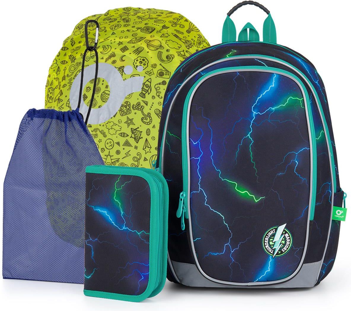 Zestaw do szkoły składający się z plecaka, piórnika, worka i pelerynki na plecak Komplet szkolny składa się z produktów: MIRA 24019 - Plecak szkolny z wzorem burzy, PENN 24019 - Piórnik szkolny z dwoma skrzydłami, ZUZA 19046 - Worek na obuwie, ZIGI 17001 - Peleryna na plecak