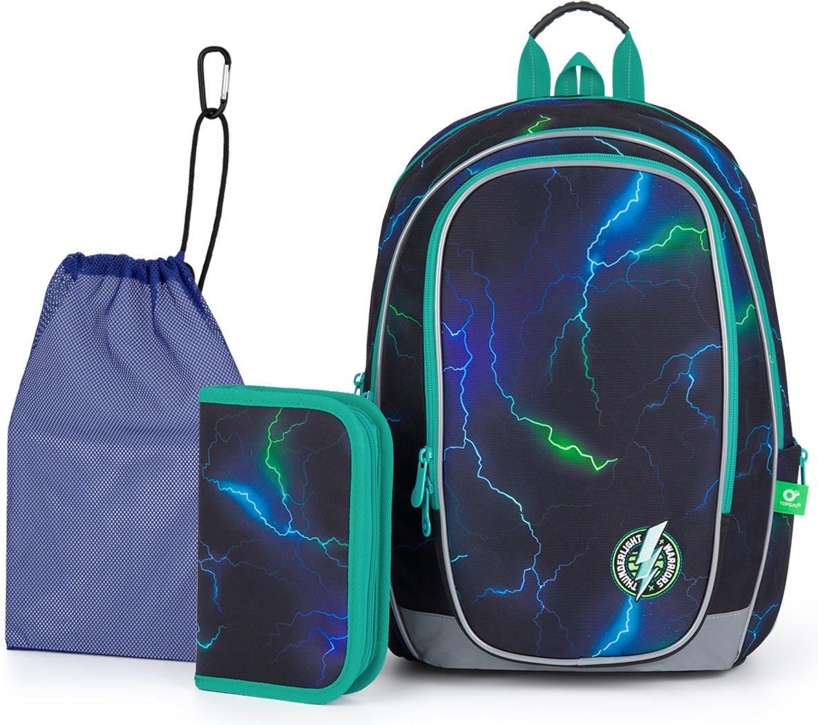 Zestaw szkolny składający się z plecaka, piórnika i worka Komplet szkolny składa się z produktów: MIRA 24019 - Plecak szkolny z wzorem burzy, PENN 24019 - Piórnik szkolny z dwoma skrzydłami, ZUZA 19046 - Worek na obuwie