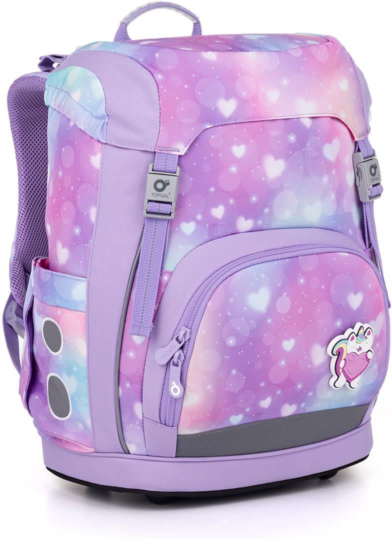 Lekki fioletowy tornister Topgal KIRA 25004 Topgal Jednokomorowy tornister KIRA jest lekką wersją klasycznego tornistra. Ma specjalny anatomicznie uformowany system pleców, dopasowany do potrzeb dziecka. Tornister bardzo łatwo otwiera się dzięki zapięciom magnetycznym Fidlock, które przesuwa się w bok. Jest to totalna innowacja opracowana z myślą o najmłodszych użytkownikach. W pojemnej komorze znajduje się przedziałka, dwie małe kieszenie na drobne przedmioty i identyfikator. W przedniej kieszeni jest uchwyt na klucze. Po bokach znajdują się dwie kieszenie na zdrową 0,5 litrową butelkę ZIVA, która nie jest wyposażeniem. Szczegóły mają znaczenie, więc do tornistra możesz dokupić PENN 25004 w tym samym wzorze. Możesz także dokupić pudełko na śniadanie z organizerem. Główne cechy waga nieco ponad 1 kg solidne, anatomicznie ukształtowane plecy z usztywnieniem jedna komora z organizerem, kieszeń z przodu regulowana wysokość zapięcia na klatce piersiowej podwójnie regulowane szelki szlufki na pas biodrowy, który możesz dokupić osobno: TOP 24021 lub TOP 24022 magnesy na końcach pasków regulacji ułatwiające zapinanie zapasów paska elementy odblaskowe: z przodu i po bokach tornistra, na paskach naramiennych wodoodporna membrana solidne, nieprzepuszczalne dno wykonane z materiału TOPDURA z nóżkami tornister został przetestowany w ITC Zlín uchwyt do zawieszenia tornistra na ławce uchwyt do noszenia tornistra w dłoni Płeć: dziewczyny Kolor: fioletowy Motyw: bajkowy Kolekcja: 2025
