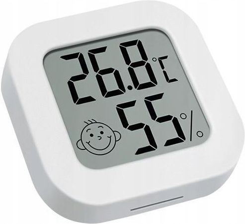 STACJA POGODY TERMOMETR HIGROMETR MINI LCD POGODOWA KOMPUTER POGODOWY Wewnętrzna, elektroniczna stacja pogody z wbudowanym czujnikiem temperatury oraz higrometrem - niezwykle przydatna w każdym domu, szczególnie w pokoju dziecka, gdzie kluczowej jest utrzymanie odpowiedniej temperatury oraz wilgotności powietrza. Wygodny montaż dzięki taśmie samoprzylepnej na odwrocie obudowy. Cechy produktu Podstawowe funkcje urządzenia: pomiar temperatury oraz wilgotności wewnętrznej. Wygodny sposób montażu (taśma samoprzylepna na odwrocie obudowy). Możliwość zawieszenia na ścianie (dedykowany otwór). Wskaźnik komfortu w pomieszczeniu (wskazanie na wyświetlaczu). Specyfikacja Materiał: plastik (ABS) Zasilanie: 1x bateria CR2032 Pomiar temperatury w stopniach °C Pomiar temperatury powietrza: od -10°C do +70°C Pomiar wilgotności powietrza: od 10% do 90% RH Rozdzielczość pomiaru wilgotności: 1% Rozdzielczość pomiaru temperatury: 0.1°C Wymiary stacji: 45 mm x 45 mm x 13 mm Kolor: biały