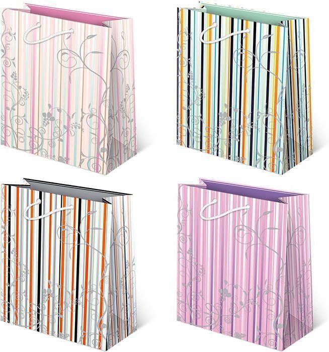 Laminowane torebki w klasycznym stylu Proponujemy eleganckie, laminowane torebki o średnich wymiarach 20 x 24 x 11 cm (szerokość x wysokość x głębokość). Są one doskonale dostosowane do przenoszenia różnorodnych przedmiotów, takich jak książki, pojemniki z kosmetykami, puszki kawy czy pudełka ze słodyczami. Cena dotyczy opakowania, w którym znajdują się 10 sztuk. W ramach jednej paczki dostarczamy paskowane torebki w różnych wzorach. EAN: 5902273827412