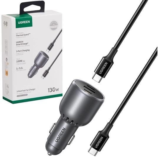 UGREEN Ładowarka Samochodowa Mocna USB + 2x USB-C 130W + kabel USB-C 1m 5A Ładowarka samochodowa UGREEN EC705 pozwala wygodnie ładować urządzenia w trasie. Dzięki łącznej mocy 130 W oraz 3 portom (2x USB-C i 1x USB-A) możesz podłączyć do niej smartfona, tablet, a nawet laptop w tym samym czasie. Obsługa technologii Power Delivery i Quick Charge 3.0 gwarantuje szybkie i bezpieczne ładowanie. Specyfikacja Producent: UGREEN Model: EC705 Kod producenta: 55511 Porty: 2x USB-C, 1x USB-A Moc: 130 W (maks.) Napięcie wejściowe: 12-24V Protokoły szybkiego ładowania: PD, QC3.0 Zalety Wysoka moc całkowita – aż 130 W: idealna do szybkiego ładowania nawet wymagających urządzeń, takich jak MacBook Pro 16" (pełne ładowanie w 90 minut). Obsługa Power Delivery i Quick Charge 3.0: zapewnia szybkie, inteligentne i bezpieczne ładowanie, automatycznie dostosowując parametry do urządzenia. Uniwersalna kompatybilność z pojazdami: działa w autach z instalacją 12–24 V, co oznacza wsparcie dla osobówek, SUV-ów, vanów i ciężarówek. Trwała i niezawodna konstrukcja: przetestowana na ponad 3000 cykli podłączania i odłączania, z antywibracyjną obudową, która nie wypada podczas jazdy. Wskaźnik LED: subtelne podświetlenie sygnalizuje działanie ładowarki i ułatwia korzystanie po zmroku. Ładuj więcej urządzeń jednocześnie 2 porty USB-C i jeden USB-A pozwalają na jednoczesne ładowanie aż 3 urządzeń. Dzięki portowi USB-C o mocy 100 W możesz w pełni naładować MacBooka Pro 16” w zaledwie 90 minut. Technologia Power Delivery zadba o optymalne tempo ładowania, dostosowując moc do potrzeb urządzenia. Kompatybilność z każdym pojazdem UGREEN EC705 działa w pojazdach z instalacją elektryczną 12-24 V, co oznacza kompatybilność zarówno z sedanami, SUV-ami, vanami, jak i ciężarówkami. To uniwersalne rozwiązanie, które sprawdzi się w każdym aucie niezależnie od jego typu i przeznaczenia. Niezawodność w każdych warunkach Konstrukcja ładowarki została przetestowana pod kątem wytrzymałości – ponad 3000 cykli podłączania i odłączania potwierdza jej niezawodność. Antywibracyjna budowa sprawia, że urządzenie pozostaje stabilnie osadzone w gnieździe zapalniczki nawet podczas jazdy po nierównych drogach. Wskaźnik LED Wbudowany wskaźnik LED umożliwia szybkie sprawdzenie, czy ładowarka działa prawidłowo. Subtelne podświetlenie ułatwia także korzystanie z urządzenia po zmroku, zapewniając wygodę i bezpieczeństwo w każdej sytuacji.