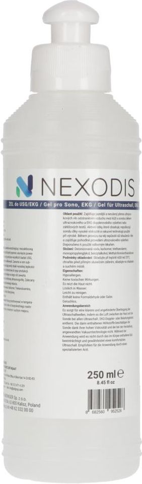 Żel do USG NEXODIS 250ml Wypróbuj nowość! – super gęsty żel NEXODIS to połączenie odpowiedniej konsystencji i niskiej ceny. Żel NEXODIS wykonany na bazie wody. Przeznaczony do diagnostyki USG i Doppler. Zapewnia lepszy obraz fal ultrasonograficznych na ekranie, zapobiegając zakłóceniom spowodowanym przepływem powietrza pomiędzy skórą a głowicą urządzenia. Dlaczego warto stosować żel do USG NEXODIS? DODATKOWO PRZEBADANE LABORATORYJNIE!! podwyższona gęstość i lepkość, dzięki czemu żel nie spływa, nie zawiera formaldehydu i soli, jest hipoalergiczny i niedrażniący, dzięki czemu jest bezpieczny i nie powoduje uczuleń, dzięki swojej strukturze i odpowiedniej gęstości zapewnia lepsze przewodzenie fal w diagnostyce USG, wyprodukowany na bazie wody, jest nieplamiący i łatwy do czyszczenia, produkt w wygodnej butelce 250 ml z dozownikiem typu TIP ułatwia dozowanie, atrakcyjna cena. Żel bezpieczny dla głowic i przetworników usg. Wykazuje wysoką odporność na wysychanie. Skład: woda dejonizowana, karbomer, trietanoloamina, monopropylen, glikol, alkohol benzylowy, metylochloroizotiazolinon, metyloizotiazolinon