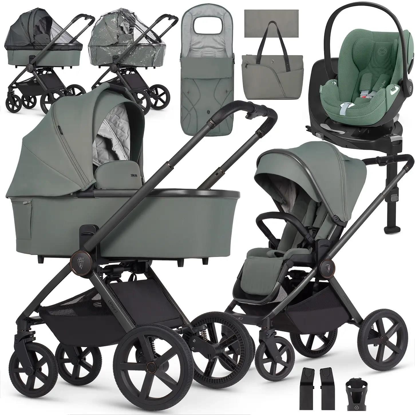 Venicci® Upline 2 w zestawie 4w1 z topowym fotelikiem Cybex® Cloud T i bazą obrotową ISOFIX Kolor wózka: zieleń aloesowa (Aloe) Stonowana, chłodna zieleń z nutą szarości – elegancka i neutralna. W praktyce „nosi się” świetnie: lepiej maskuje drobne zabrudzenia niż jasne odcienie, a jednocześnie nie …