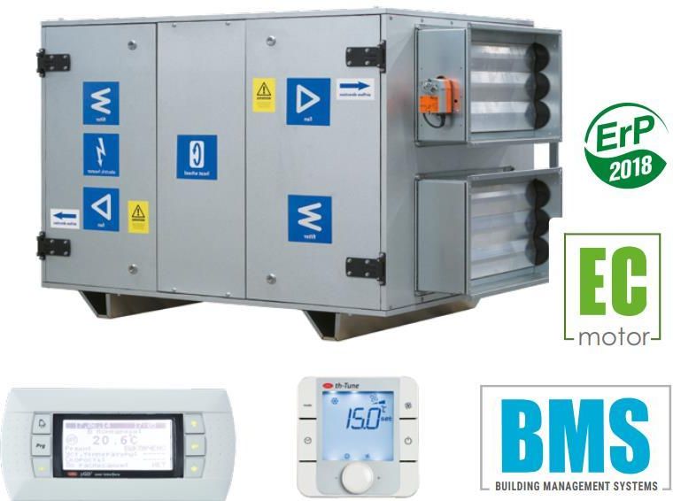Pobierz atest higieniczny. Pobierz deklaracje zgodności. Pobierz dokumentacja techniczno-ruchowa . Pobierz kartę produktu. Zastosowanie: Centrala wentylacyjna z odzyskiem ciepła to nowoczesne urządzenie wentylacyjne zapewniające mechaniczną wymianę powietrza w pomieszczeniach z jednoczesnym jego filtrowaniem. Powietrze zużyte, za pośrednictwem wymiennika rotacyjnego, ogrzewa powietrze świeże, nawiewane do pomieszczeń. Centrale są przeznaczone do energooszczędnej wentylacji obiektów oraz montażu z przewodami wentylacyjnym o przekroju 600x350, 700x400 oraz 1000x500 mm. Warianty: RH modele bez wbudowanej nagrzewnicy. RH HE modele są wyposażone w nagrzewnicę elektryczną wtórną. RH HW modele są wyposażone w nagrzewnice wodną wtórną. Obudowa: Bezszkieletowa budowa centrali wykonana jest z wysokiej jakości stali z powłoką polimerową z wewnętrzną izolacją termiczną i akustyczną z wełny mineralnej o grubości 40 mm. Filtry: Centrale są wyposażone w dwa filtry klasy F7 do filtracji powietrza nawiewanego i wywiewanego. Wentylatory: W centralach zastosowano wentylatory z silnikami komutowanymi elektronicznie typu EC, z zewnętrznym wirnikiem i łopatkami zagiętymi do tyłu. Tego typu silniki są obecnie najbardziej innowacyjnym rozwiązaniem w dziedzinie oszczędzania energii elektrycznej. Zintegrowany system elektroniki w silnikach EC umożliwia płynną regulację w pełnym zakresie prędkości obrotowej wentylatora przy zachowaniu wysokiej sprawności. Silniki komutowane elektronicznie osiągają sprawność do 90%. Zastosowanie silników EC pozwoliło zmniejszyć zużycie energii elektrycznej od 1,5 do 3 razy, przy zachowaniu wysokiej sprawności oraz niskiego poziomu hałasu. Wymiennik ciepła: Centrale RH są wyposażone w obrotowy wymiennik ciepła z aluminium. W okresie zimowym ciepło z powietrza wywiewanego jest przekazywane do ogrzania powietrza nawiewanego. Proces rekuperacji ogranicza straty cieplne poprzez wentylację, umożliwiając wymianę powietrza w kontrolowany sposób. Nagrzewnice: Centrale RH HE są wyposażone w nagrzewnicę elektryczną do dodatkowego podgrzewania nawiewanego powietrza za rekuperatorem. Nagrzewnica montowana na kanale za centralą. Centrale RH HW są wyposażone w nagrzewnicę wodną do dodatkowego podgrzewania nawiewanego powietrza za rekuperatorem. Nagrzewnica montowana na kanale za centralą. Centrale RH nie mają wbudowanej nagrzewnicy elektrycznej, ale w razie potrzeby istnieje możliwość nabycia nagrzewnicy osobno. Sterowanie: Centrale RH są wyposażone we wbudowany układ automatyki. Automatyka A31 daje możliwość podpięcia paneli sterujących A32 lub A30. Jest on elementem niezbędnym do uruchomienia i pracy centrali. Montaż: Centrala jest przeznaczona do montażu podłogowego, wewnętrznego lub zewnętrznego (przy zakupie dodatkowych akcesoriów). Konserwacja urządzenia oraz filtrów jest możliwa od strony panelu serwisowego. Centrala występuję w wersji prawej lub lewej.