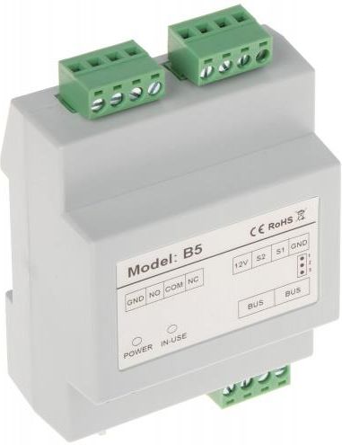 B5 - Moduł sterowania drugim wyjściem Opis B5 to nowoczesny moduł rozszerzeń przeznaczony do pracy w ramach dwużyłowych instalacji wideodomofonowych Vidos DUO. Urządzenie pozwala na rozbudowę systemu o możliwość obsługi dodatkowego rygla lub bramy automatycznej albo sterowanie oświetleniem. Moduł wspiera rygle wysokoprądowe i pozwala na konfigurację otwarcia wejścia za pomocą dodatkowego przycisku zwiernego NO. System Vidos DUO Vidos DUO to niezawodne i w pełni komfortowe rozwiązanie cyfrowe bazujące jedynie na połączeniach 2 żyłowych bez polaryzacji. Minimalizm i prostota instalacji gwarantują sprawną realizację systemów wideodomofonowych również w ramach istniejących już struktur okablowania. Szeroka oferta dedykowanych modułów rozszerzeń umożliwa dodatkowo łatwą rozbudowę funkcjonalności systemu wedle potrzeb użytkownika. Videodomofony Vidos Duo to estetyczny design i solidne wykonanie urządzeń, bardzo dobra jakość obrazu i dźwięku oraz praktyczne rozwiązania użytkowe dla najwyższego komfortu obsługi systemu. 2 żyłowe połączenia między każdym punktem w instalacji 1 zasilacz dla całego systemu możliwość podłączenia do 4 stacji bramowych do 32 lokali w systemie (256 lokali z modułem M-3F) odległość do 150m od stacji bramowej do najdalszego monitora (300m z modułem M-3F) adresowany interkom pomiędzy monitorami dodatkowy przekaźnik do obsługi rygla, automatyki bramowej lub oświetlenia dzięki modułowi B5 opcjonalne odbieranie rozmów na telefonie dzięki modułowi GSM Specyfikacja Napięcie zasilania: 24V DC Ilość przewodów: 2 bez polaryzacji Zasilanie rygla: 12V DC, 300mA Maksymalne obciążenie styków przekaźnika: 2A Pobór mocy w trybie czuwania: 1,6W Pobór mocy w trybie pracy: 4,5W Sposób montażu: Na szynie DIN lub na ścianie Temperatury pracy: -10°C ~+40°C Stopień ochrony: IP20 Wymiary (wys./szer./gł.): 89x71x45mm