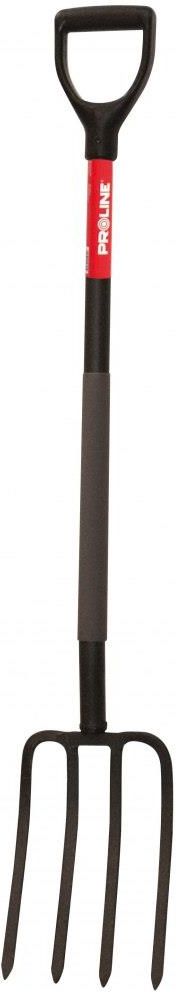 Widły marki PROLINE. Widły amerykańskie w wersji z czterema zębami. Długość całkowita wideł wynosi 120 cm. Widły posiadają prosty trzonek metalowy. Stalowe elementy wideł są hartowane.
