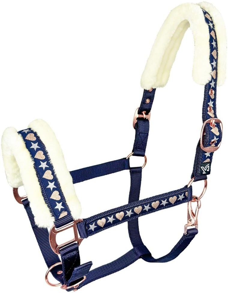 Kantar z futerkowym podszyciem, zdobiony uroczymi naszywkami z brokatowymi gwiazdkami i serduszkami. miękkie, futerkowe podszycie przy nachrapniku i potylicy możliwość regulacji nachrapnika oraz paska potylicznego z obu stron gładko wykończony karabińczyk nie obciera konia różne wersje …