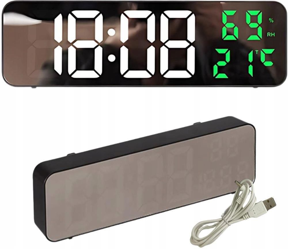 ZEGAR ELEKTRONICZY CYFROWY LED BUDZIK TERMOMETR LUSTRO STOJĄCY USB BATERIE Nowoczesny zegar cyfrowy LED to wielofunkcyjne urządzenie, które łączy w sobie stylowy design z praktycznością. Wyświetla godzinę, temperaturę, poziom wilgoci oraz pełni funkcję budzika, co czyni go idealnym dodatkiem do każdej sypialni, biura czy salonu. Dzięki powierzchni o lustrzanym wykończeniu, zegar pełni również rolę praktycznego elementu dekoracyjnego. Zasilany przez USB lub baterie, zegar jest wygodny i mobilny – można go ustawić w dowolnym miejscu. Wyraźny wyświetlacz LED zapewnia doskonałą czytelność. Funkcja budzika z opcją drzemki oraz wbudowany termometr, który monitoruje temperaturę otoczenia, sprawiają, że jest to wszechstronny gadżet do codziennego użytku. POSIADA FUNKCJĘ: ✅ Czasu rzeczywistego ✅ Daty ✅ Temperatury w stopniach Celsjusza lub w Fahrenheitach ✅ Alarmu ✅ Drzemki ✅ Poziom wilgoci w powietrzu SPECYFIKACJA TECHNICZNA: ✅ Kod produktu: 27369_Z ✅ Wysoka jakość wykonania ✅ Posiada nowoczesny design ✅ Ekran zegara spełnia funkcję lusterka ✅ Posiada duży i czytelny wyświetlacz LCD ✅ Wyświetlacz LCD podświetlany jest na biało i zielono ✅ Wyświetla godzinę w formacie 12/24h ✅ Alarm ✅ Wskaźnik poziomu wilgoci ✅ Zasilanie: 3 x bateria AAA (brak w zestawie) i kabel USB ✅ Wymiary zegara: 23cm x 7cm x 3,5cm ✅ Kolor: czarny ( zielony ) ✅ Produkt posiada certyfikat CE ZESTAW ZAWIERA: ☑️ Fabrycznie nowy zegar wielofunkcyjny ☑️ Kabel USB ☑️ Oryginalne opakowanie