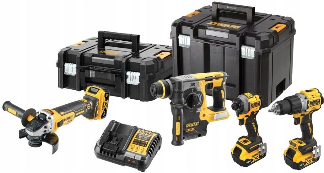 DeWALT DCK429P3T Zestaw COMBO 18V DCD805 DCF850 DCH273 DCG405 3x5,0Ah DCB1104 TSTAK CHARAKTERYSTYKA PRODUKTÓW Wiertarko-wkrętarka z udarem DCD805N DeWalt DCD805N to wszechstronna wiertarko-wkrętarka udarowa dla wymagających profesjonalistów, która zapewnia wysoki moment obrotowy 90 Nm. Możliwość regulacji momentu w 15 zakresach pozwala dostosować narzędzie do charakteru pracy. Silnik bezszczotkowy zapewnia wysoką wydajność, trwałość i mniejsze zużycie energii niż tradycyjne rozwiązania. Dwubiegowa przekładnia z metalowymi kołami zębatymi zapewnia długą żywotność i niezawodność. Narzędzie ma ergonomiczną rękojeść z okładziną antypoślizgową, wbudowaną diodę LED doświetlającą obszar roboczy oraz kompaktowe rozmiary i niewielką wagę. Dostępne są również praktyczne funkcje, takie jak hak do zawieszenia przy pasku i uchwyt magnetyczny do bitów. Zakrętarka udarowa DCF850N Wyposażona w silnik o dużej mocy wyjściowej z momentem obrotowym do 208 Nm, przeznaczona do wykonywania nawet najcięższych prac montażowych, Bezszczotkowy silnik dzięki mniejszemu tarciu ma mniejsze straty energii - może dłużej pracować na jednym naładowaniu akumulatora i cechuje się znacznie dłuższą żywotnością, Bardzo zwarta, kompaktowa budowa pozwala swobodnie pracować nią nawet w miejscach o ograniczonym dostępie, 3-biegowa regulacja prędkości obrotowej pozwala precyzyjnie dobrać właściwe parametry do wykonywanej pracy, Tryb precyzyjnego wkręcania daje dodatkową kontrolę, aby uniknąć uszkodzenia materiału i elementu mocującego, Zabezpieczenie przeciążeniowe zapewnia stałe obroty pod obciążeniem, Pierścień świetlny z trzema diodami LED zapewnia zawsze bardzo dobrą widoczność pola pracy, Sześciokątny uchwyt bitowy 1/4" (6,35 mm) umożliwia szybkie mocowanie końcówek. Młotowiertarka DCH273N Doskonała przy wierceniach pod kotwy i mocowania w betonie i w cegle otworów o średnicach od 4 mm do 24 mm Zatrzymanie obrotów do lekkiego podkuwania w tynku, ceramice lub murze oraz wyłączenie udaru do wiercenia w drewnie i metalu System Perform & Protect: najniższy w swojej klasie poziomom wibracji 6,6 m/s2 zwiększa bezpieczeństwo i komfort pracy narzędziem oraz pozwala na wydłużenie czasu pracy ciągłej operatora Bezszczotkowy silnik o dużej wydajności dla wydłużonego czasu pracy oraz zmniejszenia potrzeby serwisowania Elektroniczne sprzęgło dla wysokiego momentu obrotowego oraz zwiększonej trwałości Jasna wiązka światła LED z funkcją opóźnionego wyłączenia wpływa korzystnie na widoczność pola pracy Kompaktowa, lekka i ergonomiczna konstrukcja zwiększa komfort i ułatwia pracę użytkownika. Szlifierka DCG405N Silnik bezszczotkowy 18 V Hamulec elektroniczny szybko zatrzymuje tarczę po puszczeniu przełącznika Sprzęgło elektroniczne minimalizuje odskok w przypadku przychwycenia lub zablokowania tarczy Siatkowe osłony nie dopuszczają, by kurz był zasysany przez silnik Gumowe chwyty zapewniają lepszy chwyt i wygodę Dwupozycyjna rękojeść boczna zapewnia lepszą wygodę i kontrolę. DANE TECHNIZNE Wiertarko-wkrętarka z udarem DCD805N Zasilanie: akumulatorowe Napięcie zasilania: 18V Moc znamionowa: 800 W Moment obrotowy: 90 Nm Prędkość obrotowa: 2000/min Częstotliwość udaru: 34000/min Zdolność wiercenia (drewno/beton/stal): 53/13/13 mm Długość narzędzia: 177 mm Waga: 1.34 kg Zakrętarka udarowa DCF850N Silnik bezszczotkowy Zasilanie: akumulatorowe Napięcie zasilania: 18V Maks. moment obrotowy: 208 Nm Szerokość całkowita: 100 mm Ilość biegów: 3 biegi Prędkości na biegach 1/2/3: 0-1000/2800/3250/min Ilość uderzeń: 0-3800/min Młotowiertarka DCH273N Uchwyt: SDS-Plus Napięcie: 18V Energia udaru: 2,1J Moc użyteczna: 400W Częstotliwość udaru: 0 - 4600 ud/min Prędkość bez obciążenia: 0 - 1100 obr/min Waga: 2,5 kg Długość: 301mm Wysokość: 202mm Szerokość: 80mm Max średnica w drewnie: 26mm Max średnica w stali: 13mm Max średnica w betonie: 24mm Szlifierka DCG405N Moc pobierana: 1000 W Prędkość bez obciążenia: 9000 obr/min Maks. średnica tarczy: 125 mm Gwint wrzeciona: PL M14 Masa: 1.75 kg Długość: 310 mm Wibracje na ramionach- szlifowanie drobne: 4.4 m/s2 Niepewność pomiaru K 1 (wibracje): 1.5 m/s2 Wibracje na ramionach-szlifowanie: 2.5 m/s2 Niepewność pomiaru K 2 (wibracje): 1.7 m/s2 Ciśnienie dźwięku: 85 dB(A) Niepewność pomiaru K 1 (hałas): 3 dB(A) Ciśnienie akustyczne: 96 dB(A) Niepewność pomiaru K 2 (hałas): 3 dB(A) Moc użyteczna: 800W ZESTAW ZAWIERA bezszczotkową wiertarko-wkrętarkę udarową DCD805N, bezszczotkową kompaktową wkrętarkę udarową DCF850N, bezszczotkową wiertarkę udarową SDS-Plus 24 mm DCH273N, bezszczotkową szlifierkę kątową 125 mm DCG405N, 3x akumulator 5,0Ah DCB184, ładowarkę 4A DCB1104 Walizka TSTAK DCK429P3T