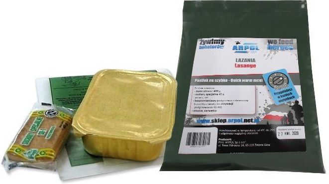 Posiłek na szybko, zestaw 1: Lazania z mięsem. Każda z racji jest oddzielnie pakowana w wodoodporną torbę foliową i termozgrzewalnie zamykana. Rację żywnościową przyrządzamy za pomocą podgrzewacza chemicznego. Takie rozwiązanie pozwala na podgrzanie posiłku bez konieczności rozpalania ognia. W zestawie znajduje się: - posiłek 400 g - suchary specjalne SU1 45 g - bezpłomieniowy podgrzewacz chemiczny - saszetka z wodą do aktywacji podgrzewacza 45 ml - serwetka - łyżka - sól, pieprz Wartość energetyczna posiłku: 604 kcal Wartość energetyczna sucharów: 171 kcal Waga: 602 g