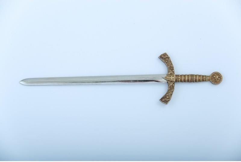 NOŻYK DO OTWIERANIA LISTÓW DENIX MODEL 3066 DANE TECHNICZNE: Przedstawiamy nożyk do listów, będący miniaturką repliki miecza Templariuszy z XII w. Doskonała replika miecza używanego w wyprawach krzyżowych w tamtych czasach. Charakterystyczny kształt rękojeści. Ostrze wykonane ze stali dmuchanej, niehartowanej, chromowanej o wysokim połysku. Rękojeść- cynkal. Wspaniale udekoruje każdy gabinet i jest wspaniałym pomysłem na prezent. Materiał: całkowicie metalowy Rozmiar: 25 cm, Waga: 70 g Kolor: srebrne ostrze, złota rękojeść, Producent : DENIX SA Hiszpania HISTORIA: Templariusze, czyli Zakon Ubogich Rycerzy Chrystusa i Świątyni Salomona, powstał w 1118 roku. Na czele Zakonu stał wielki mistrz. Początkowo Templariusze byli tylko strażnikami szlaków pielgrzymkowych, by następnie wraz ze swoim liczebnym wzrostem stać się jedną z ważniejszych stron militarnych.