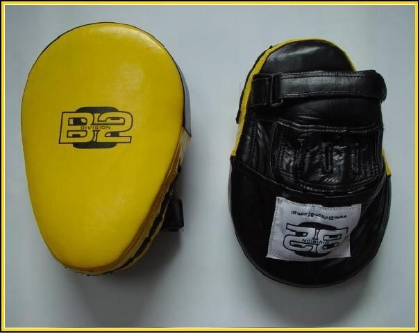 Tarcze trenerskie marki Division B-2. Tarcze te cechuje specjalny zakrzywiony profil i mała powierzchnię przykładania ciosu. Dzięki temu zawodnik osiąga lepsze wyniki pod kątem refleksu i precyzji. System otworów wentylacyjnych zapewnia trenerowi zawsze suche dłonie. Porządne zapięcia na rzep maksymalizują przyczepność i niwelują do zera przypadki zsuwania się tarcz z dłoni. Gruba, specjalnie uformowana pianka doskonale pochłania energię kinetyczną ciosów. Materiał: skóra naturalna Kolor: Czarno-żółty Rozmiar: 17 x 24 cm Produkt oferowany w parze (2 sztuki). Marka DIVISION B-2 powstała z połączenia naszej pasji do sztuk walki, ponad 16-letniego doświadczenia na rynku i potrzeby dostarczenia użytkownikowi najwyższej jakości sprzętu w atrakcyjnej cenie. W naszym sprzęcie bokserskim i treningowym zawarte są wszystkie rozwiązania technologiczne niezbędne zarówno dla profesjonalnego sportowca, jak i dla amatora. Wysokiej klasy sprzęt naszej marki to efekt niestrudzonej i intensywnej pracy w celu sprostania wymaganiom dzisiejszych zawodników trenujących sztuki walki. PROFESJONALNE SKÓRZANE TARCZE TRENINGOWE MARKI DIVISION-B2 Z ETYKIETĄ POTWIERDZAJĄCĄ 100% ORYGINALNOŚCI
