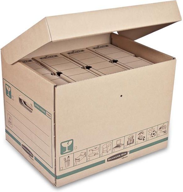 Pudło EXTRA STRONG średnie 338×312×428 mm 20 sztuk – pudło archiwizacyjne przeprowadzkowe: Wytrzymałe, super bezpieczne i wygodne pudła transportowo-archiwizacyjne (znane też jako pudła przeprowadzkowe) do biura i domu. Udźwig do 35 kg. Idealne do przechowywania w domu (garażu, spiżarni, piwnicy, na strychu). W biurze zapewniają bezpieczeństwo – dzięki dodatkowym otworom na wieku mogą zostać zaplombowane. – Wytrzymałe i bezpieczne pudło na archiwa. Wykonane z bardzo grubej tektury falistej z potrójnym systemem ścian bocznych. Udźwig do 35 kg dla pudła średniego (przy równomiernym rozłożeniu zawartości). – Bezpieczny transport. Otwory w ścianach bocznych ułatwiają przenoszenie. – Bezpieczne przechowywanie. Otwory w wieku i na bokach umożliwiają plombowanie zawartości (plomby nie są sprzedawane wraz z pudłem). – Czytelne oznakowanie. Duże etykiety do opisu zawartości na bokach oraz ikony na bokach pudła i wieku. – Uchylne wieko ułatwia zamknięcie pudła. – Dostępne w dwóch rozmiarach – średnim i dużym. Duże pudło zobacz tutaj – Wymiary pudła średniego: zewnętrzne: 338sz. x 312w. x 428gł mm, wewnętrzne: 325 x 300 x 390mm – Minimalne zamówienie online 20 szt. Cena dotyczy 20 sztuk. Pudło archiwizacyjne zbiorcze – rozmiar średni – mieści: 4 pudełka na akta 80mm lub 3 pudełka na akta 100mm lub 5 segregatorów z dźwignią A4 70mm lub 7 segregatorów z kółkami A4 35mm Kod 7205301 L SERIA Bankers Box EXTRA STRONG Fellowes Wymiary produktu zewnętrzne 338 × 312 × 428 mm Wymiary produktu wewnętrzne 325 × 300 × 390 mm Możliwość ustawienia jeden na drugim do 5 sztuk Rodzaj zamknięcia uchylne wieko Możliwość przechowywania pudełek na akta 80mm 4 Możliwość przechowywania pudełek na akta 100mm 3 Możliwość przechowywania segregatora 70 mm 5 Możliwość przechowywania segregatora 35 mm 7 50% mocniejsze Tak W 100% nadający się do przetworzenia Tak Zasadź drzewo Tak