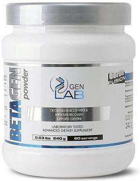 BETAGEN firmy GENLAB jest suplementem zawierającym wysokiej jakości aminokwas Beta-alaninę oraz witaminę B6. Beta Alanina jest aminokwasem zwiększającym poziom karnozyny w komórkach mięśniowych. Karnozyna działa buforująco na komórki mięśniowe, przeciwdziałając zakwaszaniu się ich w trakcie wykonywania przez nie pracy. Sposób użycia: 1 miarka (4 g) przed treningiem Wielkość porcji: 1 miarka (4 g) BETAGEN POWDER Ilość w 1 porcji (4 g) %ZDS* w 1 porcji (4 g) Beta Alanina 3600 mg ** Witamina B6 0.7 mg 54 % (*)% ZDS: Zalecana dzienna dawka oparta jest na diecie 2.000 kcal dla osób pomiędzy 19-55 r. ż. Wartości odżywcze pochodzą z analizy podstawowych składników produktu i mogą się minimalnie różnić w zależności od danego smaku produktu (jeżeli występuje w kilku smakach). (**) Zalecanego dziennego spożycia nie ustalono. Składniki: beta alanina, witamina B6 (chlorowodorek pirydoksyny), regulator kwasowości: kwas cytrynowy, substancja słodząca: stewioglikozydy.