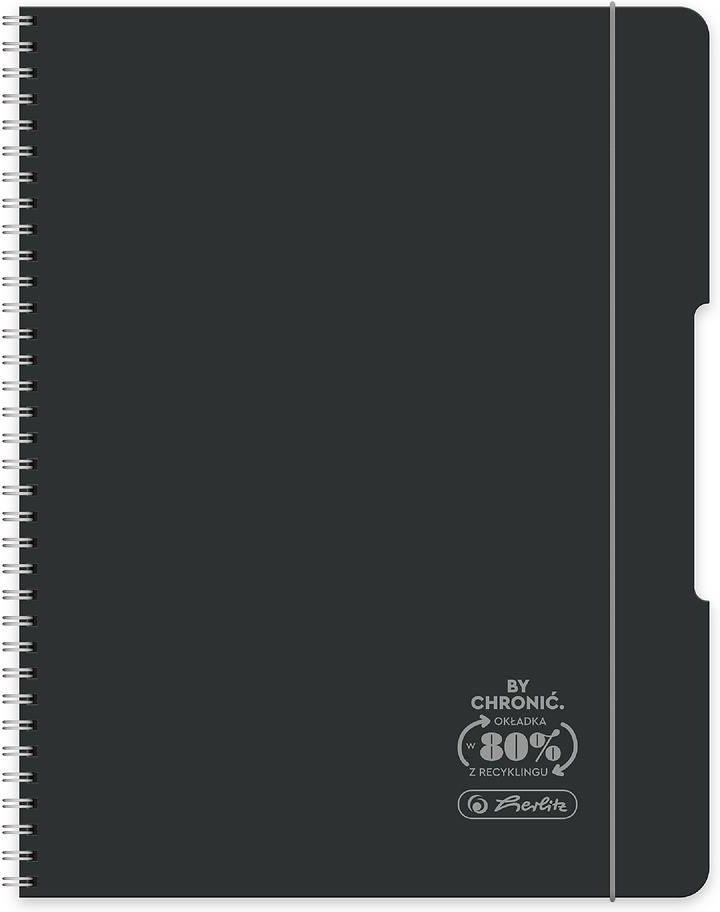 Kołozeszyty Herlitz Eco PP to idealne połączenie nowoczesnej formy, stylowego wyglądu i troski o środowisko. Ich okładki wykonane z trwałęgo polipropylenu, pokryte delikatnymi, botanicznymi nadrukami, wyróżniają się subtelnym, naturalnym charakterem i jednocześnie oferują trwałą, wodoodporną ochronę. Co ważne, 30% użytego materiału pochodzi z recyklingu odpadów postprodukcyjnych, które powstały przy produkcji miękkiego plastiku, a całość w 100% nadaje się do ponownego przetworzenia. Zeszyt wyposażony jest w czarną, podwójną spiralę, która umożliwia otwarcie na płasko i wygodne pisanie na każdej stronie, a czarna gumka zamykająca chroni notatki i zapobiega ich zaginaniu. To idealne rozwiązanie dla uczniów i studentów, którzy chcą sięgać po produkty świadome, trwałe i estetyczne. Dostępne w czterech pastelowych kolorach z nadrukiem: błękitnym, miętowym, różowym i turkusowym. Cechy główne 30% materiału z recyklingu – z odpadów postprodukcyjnych, czyli powstałych przy produkcji miękkiego plastiku W 100% nadaje się do ponownego przetworzenia – produkt przyjazny dla planety Wodoodporna okładka z trwałego polipropylenu – idealna do intensywnego użytku Czarna podwójna spirala – zeszyt otwiera się idealnie na płasko, ułatwiając pisanie Gumka zamykająca – chroni zawartość i utrzymuje porządek w notatkach Cechy dodatkowe Okładka: polipropylen z botanicznym nadrukiem Liniatura z nagłówkiem ułatwia porządkowanie notatek Czarna, podwójna spirala Czarna gumka zamykająca W 100% nadaje się do recyklingu Oznaczony certyfikatem FSC Format B5 80 kartek w kratkę Papier o gramaturze 70 g/m2 ilość: 1 zeszyt kolor: czarny