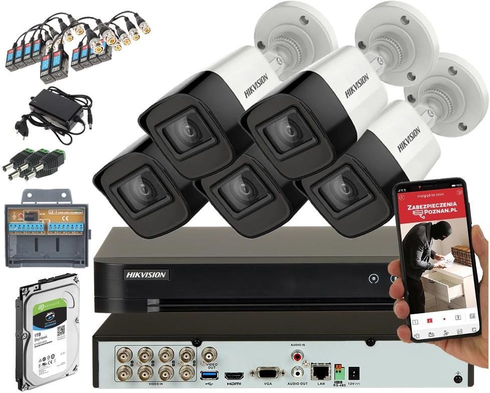Zestaw monitoringu Hikvision zawiera: 5x Kamera tubowa Hikvision DS-2CE17H0T-IT3F(C) 2.8mm 5MPx TurboHD, 8-kanałowy rejestrator wielosystemowy Hikvision iDS-7208HUHI-M1/S TurboHD AcuSense, 1x Zasilacz do kamer + rozdzielacz zasilania, 10x Transformator video TR-1D-UHD 1x Dysk do monitoringu HDD-ST2000VX005 1TB SkyHawk SEAGATE (nagrywanie 24/7) Komplet złącz i wtyków do wyboru na przewód UTP lub koncentryczny.