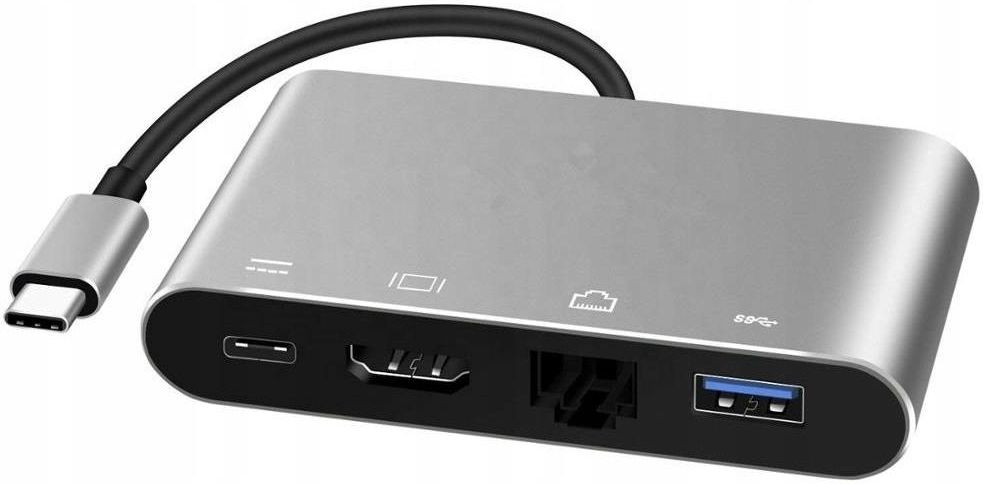 HUB USB-C Adapter HDMI 4K 3840*2160 LAN RJ45 USB 3.0 5Gbps PD do 100Mb/s Wejście HDMI obsługuje rozdzielczość do 4K 3840*2160 Funkcja Power Delivery PD umożliwia szybkie ładowanie poprzez gniazdo USB typ C Gniazdo sieciowe LAN RJ45 z prędkością do 100Mb/s Adapter HUB USB-C LAN ✔️Adapter HUB USB-C umożliwia przesyłanie sygnału audio i video z laptopa na ekran monitora, telewizora lub projektora z wejściem HDMI w rozdzielczości do 4K ✔️Posiada funkcję Power Delivery - umożliwia ładowanie laptopa poprzez port USB-C ✔️Gwarantuje doskonałą jakość obrazu dzięki wsparciu rozdzielczości do 4K Ultra HD UHD 4k@30Hz (3840*2160) poprzez port HDMI ✔️Adapter HUB USB-C umożliwia podłączenie kabla sieciowego LAN RJ-45. Ciesz się niezawodnym i szybkim połączeniem z prędkością do 100Mb/s ✔️Dzięki niemu zyskasz dwa dodatkowe porty USB 3.0 o przepustowości do 5Gbps ✔️Wzmocniona aluminiowa wtyczka zapewni długą żywotność ✔️Idealny do podpięcia myszki, klawiatury, drukarki lub pendrive'a ✔️Niewielki rozmiar i estetyczny wygląd zapewniają wysoką kulturę pracy