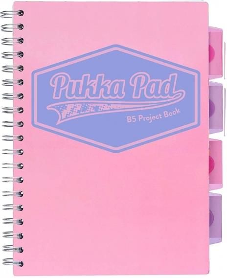 Kołozeszyt PUKKA PAD Project Book Pastel B5 różowy Kołozeszyt Pukka Pad w kartkę z serii PASTEL PROJECT BOOK w formacie B5 to doskonały wybór dla osób, które cenią sobie estetyczny wygląd oraz zwracają uwagę na jakość wykonania i funkcjonalność zeszytów w życiu codzienny. Minimalistyczna, klasyczna okładka w wyjątkowym kolorze pastelowym różowy, wygląda obłędnie i nadaje niezwykle indywidualnego charakteru zeszytowi. Produkt został wzbogacony o kolorowe przekładki, które współgrają bezpośrednio z okładką. Przepiękne kolory to nie jedyna zaleta zeszytu! Przekładki z pojemnymi kieszeniami można dowolnie przestawiać w obrębie zeszytu, dzięki temu możemy ustalać dowolną ilość kartek do poszczególnych zadań. Dlatego świetnie sprawdzi się w roli zeszytu studenta, który może decydować o ilości notatek do konkretnego wykładu! Dodatkowa polipropylenowa i niezwykle odporna okładka ochrona daje nam gwarancję braku zagięć kartek, dzięki temu nasz zeszyt zawsze wygląda perfekcyjnie. Kołozeszyt sprawdzi się również w roli: notatnika, kalendarza, książki adresowej, pamiętnika. Ilość stron- 200 Grubość papieru- 80g Kolor okładki- pastelowy różowy Ilość przekładek- 4
