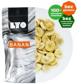 Liofilizowane banany Lyofood w czystej postaci, pokrojone w plasterki są idealne jako przekąska.Liofilizowany banan w plastrach to naturalna zdrowa przekąska dla dzieci i dorosłych. Ze względu na swoje wartości odżywcze świetnie sprawdza się jako drugie śniadanie lub prowiant w podróży. Dzięki niskej wadze możesz je mieć zawsze przy sobie - nawet w najbardziej ekstremalnych warunkach. Zdrowa alternatywa do smażonych w tłuszczu - suszonych bananów.Banany z powodzeniem mogą zastąpić nam słodycze, a przy tym są naturalnym źródłem witaminy A, C, K oraz tych z grupy B. Owoce zawierają błonnik, wapń, magnez i fosfor, a co najważniejsze są źródłem cennego potasu. Potas jest niezbędny w równowadze elektrolitycznej organizmu, a w szczególności w diecie osób, które stosują dużo soli. Dodatkowo Potas znany jest jako pierwiastek naturalnie obniżający ciśnienie krwi.Termin przydatności: 2 lataSKŁADNIKI I WARTOŚCI ODŻYWCZE Wartości odżywczeNa 100gNa porcję 30g Kalorie 1577 kJ / 373 kcal 473 kJ / 112 kcal Tłuszcz 1,32 g 0,40 g W tym kwasy tłuszczowe nasycone 0,45 g 0,14 g Węglowodany 80,64 g 24,19 g W tym cukry 48,92 g 14,68 g Błonnik 10,40 g 3,12 g Białko 4,36 g 1,31 g Sól 0,01 g 0 g DLACZEGO POSIŁKI LYO EXPEDITION SĄ TAK WYJĄTKOWE? 100% NATURALNYCH SKŁADNIKÓW Do przygotowania naszych posiłków są stosowane tylko naturalne składniki bez konserwantów, sztucznych dodatków, barwników czy wzmacniaczy smaku. Większość ziół pochodzi z naszych własnych plantacji co sprawia ze posiłki LYO są naprawdę wyjątkowe. SMAK PRAWDZIWEGO POSIŁKU Przywiązujemy dużą uwagę nie tylko do procesu liofilizacji, ale również do sposobu przyrządzania naszych potraw.Potrawy przyrządzane są z najwyższej jakości składników dokładnie tak jak gotujemy nasz posiłek w domu. ORYGINALNY KSZTAŁT I FORMA PRODUKTÓW. Proces liofilizacji pozwala na zachowanie oryginalnej formy i kształtu wszystkich składników. Dzięki temu nasze posiłki nie tylko smakują ale także wyglądają jak domowy obiad. WYSOKA WARTOŚĆ ODŻYWCZA Liofilizowane posiłki są wysokokaloryczne. Dodatkowo produkty zachowują swoje naturalne wartości mineralne i witaminy. Spożycie posiłku LYO EXPEDITION daje energie na długotrwały wysiłek. NISKA WAGA Liofilizowane jedzenie, dzięki usunięciu 98% wody, jest znacząco lżejsze od standardowego produktów. Posiłki są lekkie i kompaktowo zapakowane. DŁUGI TERMIN PRZYDATNOŚCI DO SPOŻYCIA Posiłki LYO EXPEDITION mogą być przechowywane przez długi czas. Brak wody, która zostaje usunięta podczas procesu liofilizacji uniemożliwią rozwój mikroorganizmów. Dodatkowo każda torebka jest hermetycznie zamknięta i zawiera pochłaniacz tlenu. WYSOKI STANDARD BEZPIECZEŃSTWA Aby upewnić się ze posiłki LYO EXPEDITION są bezpieczne pod każdym względem, są one dwukrotnie badane w laboratorium. Pierwszy raz po ugotowaniu i drugi raz po liofilizacji. ULTRALEKKIE I FUNKCJONALNE OPAKOWANIE Oferujemy ultralekkie opakowanie, które umożliwia wygodne przygotowanie potrawy bezpośrednio w opakowaniu.