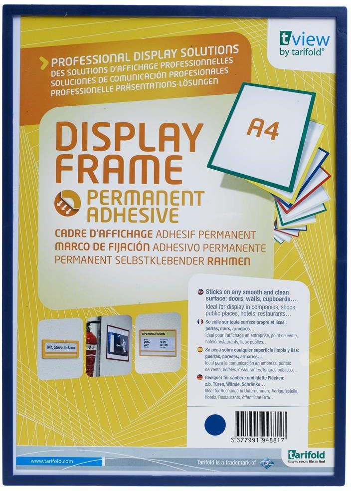 SAMOPRZYLEPNY IDENTYFIKATOR NAŚCIENNY A4 TARIFOLD NIEBIESKI: Samoprzylepny identyfikator naścienny Tarifold z ramką w kolorze niebieskim wykonaną z wyjątkowo wytrzymałego tworzywa ABS, odporną na pęknięcia lub zniszczenia. Rozmiar: A4. Na tyle identyfikatora znajduje się taśma samoprzylepna, która daje możliwość jego zamocowania na każdej gładkiej i czystej powierzchni. Produkt stworzony do eksponowania i podkreślania prezentowanych informacji lub innych treści, bez użycia gwoździ i śrub. Kolorowa ramka skutecznie przyciąga uwagę. Możliwe użycie zarówno w pionie jak i w poziomie. Dostarczany w opakowaniu po 1 szt. 194881 TR