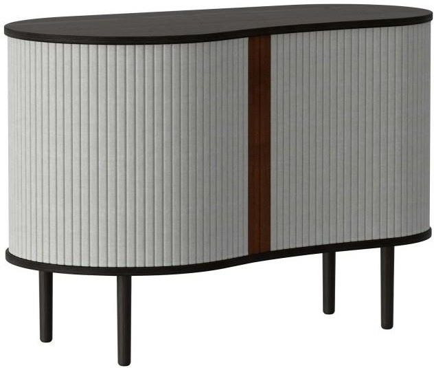 Audacious to kolejna kolekcja komód od marki UMAGE. Tym razem producent postawił na nieregularny kształt oraz tapicerowaną tkaniną żaluzję. Odważny projekt idealnie pasować będzie zarówno do wnętrz zaaranżowanych w stylu minimalistycznym, jak i retro. Komoda składa się z dwóch niezależnych części (żaluzji) - każda z nich przesuwa się niezależnie. Sam możesz zdecydować jak wiele wnętrza chcesz pokazać. Stawiając natomiast komodę pod samą ścianą, będzie sprawiała ona wrażenie, jakby w całości była otoczoną tkaniną. Komoda ma kształt nerki i swoim stylem nawiązuje do duńskiego designu. Całość tworzy solidną konstrukcję wykonaną z litego drewna dębowego i bukowego oraz fornirowanej sklejki. Żaluzja natomaist tapicerowana jest tkaniną poliestrową o podwyższonych parametrach użytkowych, dostępną w kilku kolorach. Ranty tapicerowanych paneli wykończono eko-skórą. Wygląd komody można dowolnie modyfikować, zmieniając kolory tapicerowanych paneli, które można bez problemu dokupić. Komoda przeznaczona jest do własnego montażu.