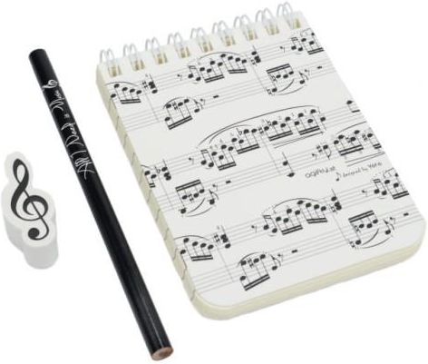 Zestaw biurowy z motywem nut – mały Najważniejsze cechy: Elegancki zestaw biurowy dla miłośników muzyki W komplecie znajduje się: Notesik w linie w formacie A7 z motywem nut na białym tle Ołówek czarny Gumka z motywem klucza wiolinowego