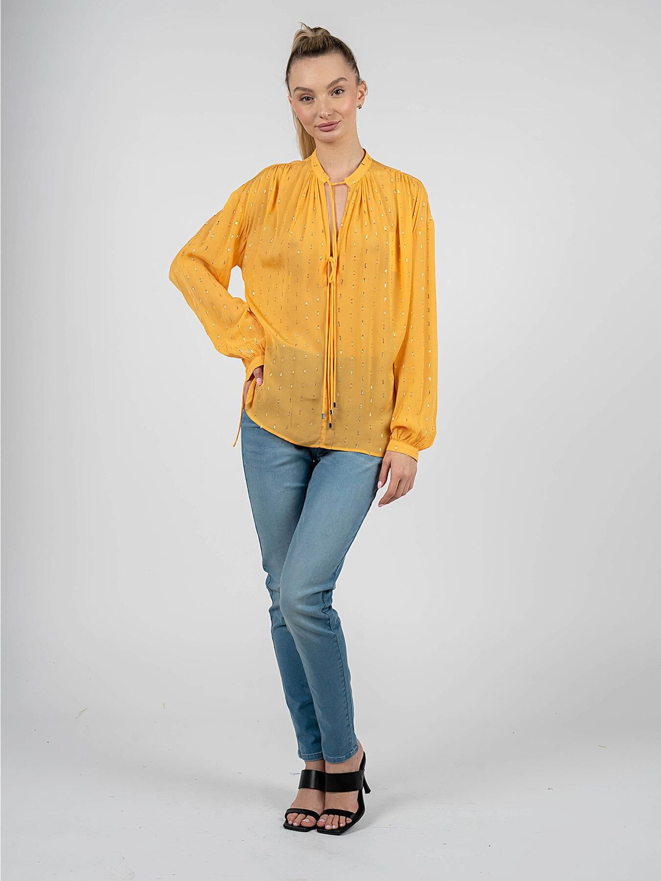 Prosty fason Transparentna Ze wzorem z metaliczną nicią Głęboki dekolt w kształcie litery V Wycięcie ozdobione sygnowanym wiązaniem Długie rękawy Rękawy zakończone mankietami z wiązaniem Po bokach rozcięcia Wykonana z wysokiej jakości tkaniny