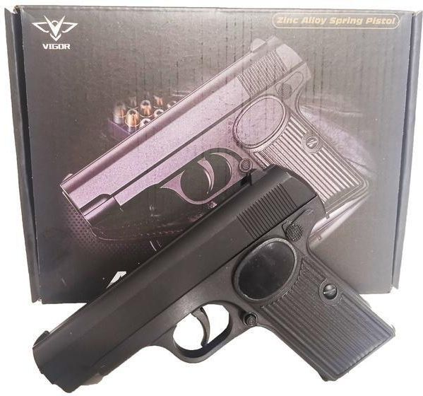 Prezentujemy realistyczną replikę pistoletu, wykonaną z solidnego plastiku i metalu. Ta replika jest dociążana, co nadaje jej realistyczny wygląd i wagę 210 g. Pistolet ma wymiary 16,5cm, co sprawia, że jest wygodny w użyciu i dobrze leży w dłoni. Strzela plastikowymi kulkami o średnicy 6 mm, co czyni go idealnym do zabawy i treningu. Dodatkowo, pistolet posiada wyciągany magazynek oraz mechanizm sprężynowy, który przeładowuje się poprzez naciągnięcie sprężyny znajdującej pod zamkiem pistoletu. Zamek jest wykonany z metalu, a reszta z kompozytu plastikowego, co zwiększa trwałość i funkcjonalność zabawki. Produkt jest pakowany w solidne pudełko ze styropianową formą, co zapewnia jego bezpieczeństwo podczas transportu. Cechy produktu: Solidne wykonanie: Pistolet wykonany z wysokiej jakości tworzywa sztucznego i metalu, odpornego na uszkodzenia. Mechanizm sprężynowy: Ręczne przeładowanie poprzez naciągnięcie sprężyny pod zamkiem pistoletu zapewnia większą interaktywność i realizm podczas zabawy. Wyjmowany magazynek: Umożliwia szybkie ładowanie kulkami plastikowymi o średnicy 6mm. Kompaktowy rozmiar: Wymiary 16,5 cm sprawiają, że pistolet jest wygodny w obsłudze nawet dla młodszych użytkowników. Pakowanie: Produkt zapakowany w solidne pudełko ze styropianową formą, co chroni go przed uszkodzeniami podczas przechowywania i transportu. Realistyczna waga: Dociążany pistolet o wadze 210 g. Metalowy zamek: Zwiększa trwałość i realistyczne odczucie. Specyfikacja techniczna: Materiał: Solidne tworzywo sztuczne i metal. Mechanizm: Sprężynowy, ręcznie przeładowywany poprzez naciągnięcie sprężyny pod zamkiem pistoletu. Amunicja: Kulki plastikowe o średnicy 6mm. Wymiary: 16,5 cm. Waga: 210 g. Pakowanie: Solidne pudełko ze styropianową formą. W zestawie: Pistolet sprężynowy. Wyjmowany magazynek. Komplet kulek plastikowych na start. Idealny do: Zabawy na świeżym powietrzu lub w domu. Treningów precyzyjnego strzelania. Prezentu dla fanów militariów i realistycznych modeli broni. Dlaczego warto? Pistolet łączy w sobie trwałość, kompaktowe wymiary i funkcjonalność. Jest idealnym wyborem dla osób szukających lekkiej, a jednocześnie solidnej imitacji broni. Dzięki wyjmowanemu magazynkowi i sprężynowemu mechanizmowi, użytkowanie pistoletu staje się przyjemne i realistyczne. Grupa wiekowa: 18+ Opakowanie: pudełko