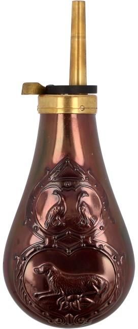 DP529-44, prochownica firmy Davide Pedersoli dozownikiem. Przeznaczona do rewolwerów czarnoporochowych Remington w kalibrze .44. Naważka prochu 24 grs. Wykonana z lakierowanej miedzi, z motywem myśliwskim oraz dozownikiem z mosiądzu.
