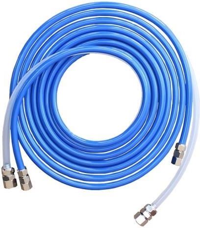 Wąż podwójny do zbiornika ciśnieniowego o długość 10 m - powietrzny i materiałowy. Zestaw składa się z dwóch przewodów zespolonych ze sobą, bezbarwny służy do podawania materiału tj. lakiery, bejce, kleje itp. okuty dwustronnie końcówkami na gwint wewnętrznym 3/8" oraz niebieski do powietrza okuty dwustronnie gwint wewnętrznym 1/4". Węże posiadają standardowe końcówki pasujące do pistoletów lakierniczych z dolnym podejściem np. Expert.
