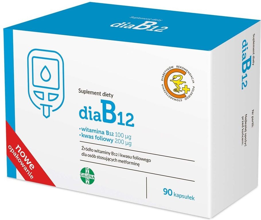 Galena Diab12 Witamina B Kwas foliowy, 90 kapsułek Opis produktu DiaB12 to suplement diety w formie kapsułek zawierający witaminę B12 w postaci cyjanokobalaminy oraz foliany w postaci kwasu foliowego (kwasu pteroilomonoglutaminowego). Produkt przeznaczony jest dla osób dorosłych w celu uzupełnienia codziennej diety w te składniki. Preparat dostępny jest w opakowaniu zawierającym 90 kapsułek. Zastosowanie Produkt rekomendowany jest do uzupełniania diety w witaminę B12 i kwas foliowy u osób dorosłych, w tym u osób mogących mieć obniżony poziom witaminy B12. Suplementacja ma na celu wspomaganie prawidłowego funkcjonowania układu nerwowego oraz procesów krwiotwórczych. Składniki Celuloza mikrokrystaliczna, żel celulozowy (substancja wypełniająca), żelatyna, skrobia modyfikowana, sole magnezowe kwasów tłuszczowych, dwutlenek krzemu, dwutlenek tytanu (barwnik), kwas foliowy, witamina B12, cytrynian trisodowy (nośnik), kwas cytrynowy (nośnik), błękit patentowy V (barwnik). 1 kapsułka zawiera: Foliany (kwas foliowy / kwas pteroilomonoglutaminowy) – 200 µg (100% RWS*), Witamina B12 (cyjanokobalamina) – 100 µg (4000% RWS*). Zalecane dzienne spożycie Dorośli: 1 kapsułka dziennie, najlepiej między posiłkami. Kapsułkę należy połknąć i popić wodą. Nie należy przekraczać zalecanej porcji do spożycia w ciągu dnia. Ostrzeżenia dotyczące bezpieczeństwa Nie stosować u osób uczulonych na którykolwiek składnik preparatu, w tym na cyjanokobalaminę lub kobalt. Produkt nie jest przeznaczony dla dzieci, młodzieży, kobiet w ciąży i karmiących piersią. Rzadko mogą wystąpić łagodne dolegliwości żołądkowo-jelitowe lub reakcje alergiczne. Suplement diety nie może być stosowany jako substytut zróżnicowanej diety. Osoby z chorobami przewlekłymi lub zaburzeniami wchłaniania powinny skonsultować stosowanie produktu z lekarzem. Warunki przechowywania Przechowywać w suchym i chłodnym miejscu, w sposób niedostępny dla małych dzieci. Chronić przed światłem i wilgocią. Temperatura przechowywania poniżej 25°C. Zawartość netto 90 kapsułek