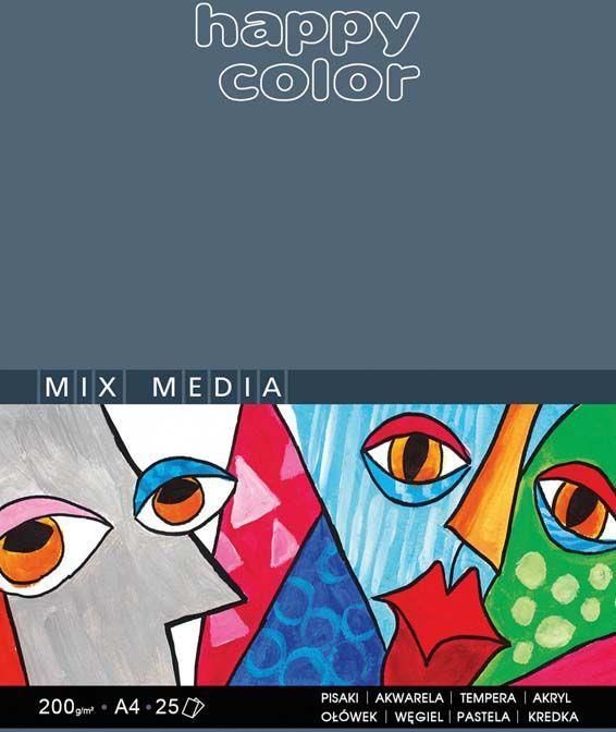 Blok Mix Media marki Happy Color. Wysokiej jakoci 25 arkuszy biaego papieru w formacie A3. Bezkwasowy i bezdrzewny papier o gramaturze 200g pozwala na prac z rnymi mediami takimi jak: owek, wgiel czy pastele. Bardzo dobrze sprawdza si podczas pracy z farbami na bazie wody - akwarel, gwaszem i akrylem, gdy nie ulega nadmiernemu falowaniu. Papier jest trway i odporny na starzenie (zgodny z norm ISO 9706). Zwarta struktura gwarantuje odporno na rozmazywanie i cieranie gumk.