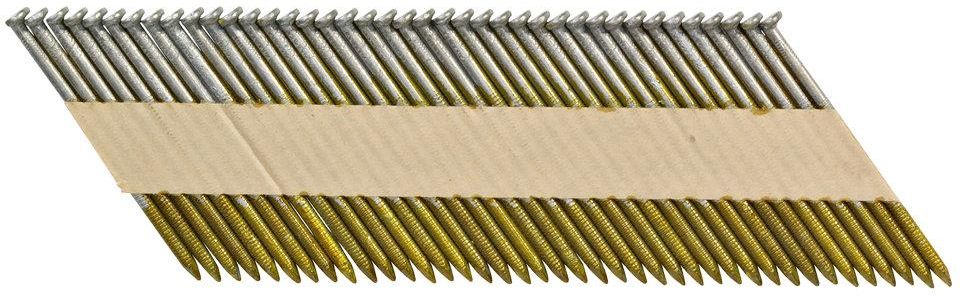 Mocowane na tasmie i ocynkowane elektrolitycznie gwozdzie do mocowania paneli i zbijania róznych konstrukcji. Gwozdzie maja oznakowanie CE i sa dostosowane do uzytku na zewnatrz pomieszczen. Kat mocowania na tasmie: 34°. Grupa gwozdzi C.