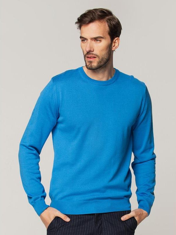 Sweter męski Willsoor Kolor: niebieski Dekolt: okrągły (typ O-neck) Skład: 50% bawełna, 50% akryl Rękawy wykończone ściągaczem Dół wykończony ściągaczem Elastyczna tkanina, prosty fason Jakość: pierwsza Gwarancja: 24 m-ce
