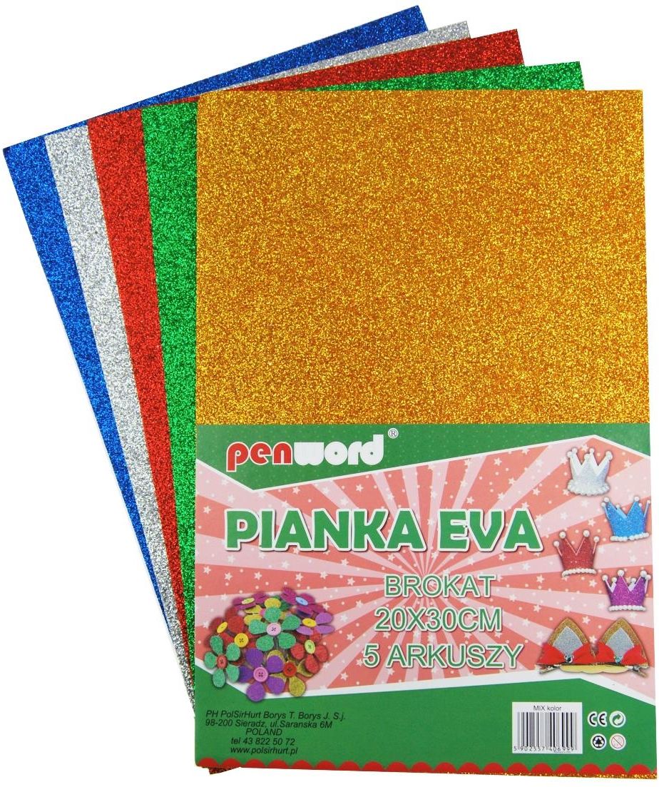 Set pianki brokatowej w rozmiarze 20x30 cm - 5 sztuk Przedstawiamy Wam zestaw 5 arkuszy pianki brokatowej o wymiarach 20x30 cm. Jest to doskonałe narzędzie dla dzieci do tworzenia rozmaitych prac manualnych. Za pomocą tego produktu maluchy mogą wykonać piękne ozdoby, karty okolicznościowe, a także inne ciekawe rękodzieła. Produkt jest dostępny w mixie kolorów, dzięki czemu małe rączki mogą stworzyć różnorodne projekty, dostosowane do swoich upodobań i wymagań. W ten sposób rozwiną swoją kreatywność, a także nauczą się precyzyjnej pracy manualnej. Pianka brokatowa jest nie tylko efektowna, ale również bardzo praktyczna. Brokat na jej powierzchni jest mocno przylegający, co minimalizuje ryzyko rozsypywania się i pozwala na czystą i bezproblemową pracę. Przy tym jest to produkt bezpieczny i odpowiedni dla dzieci. EAN: 5902557406999