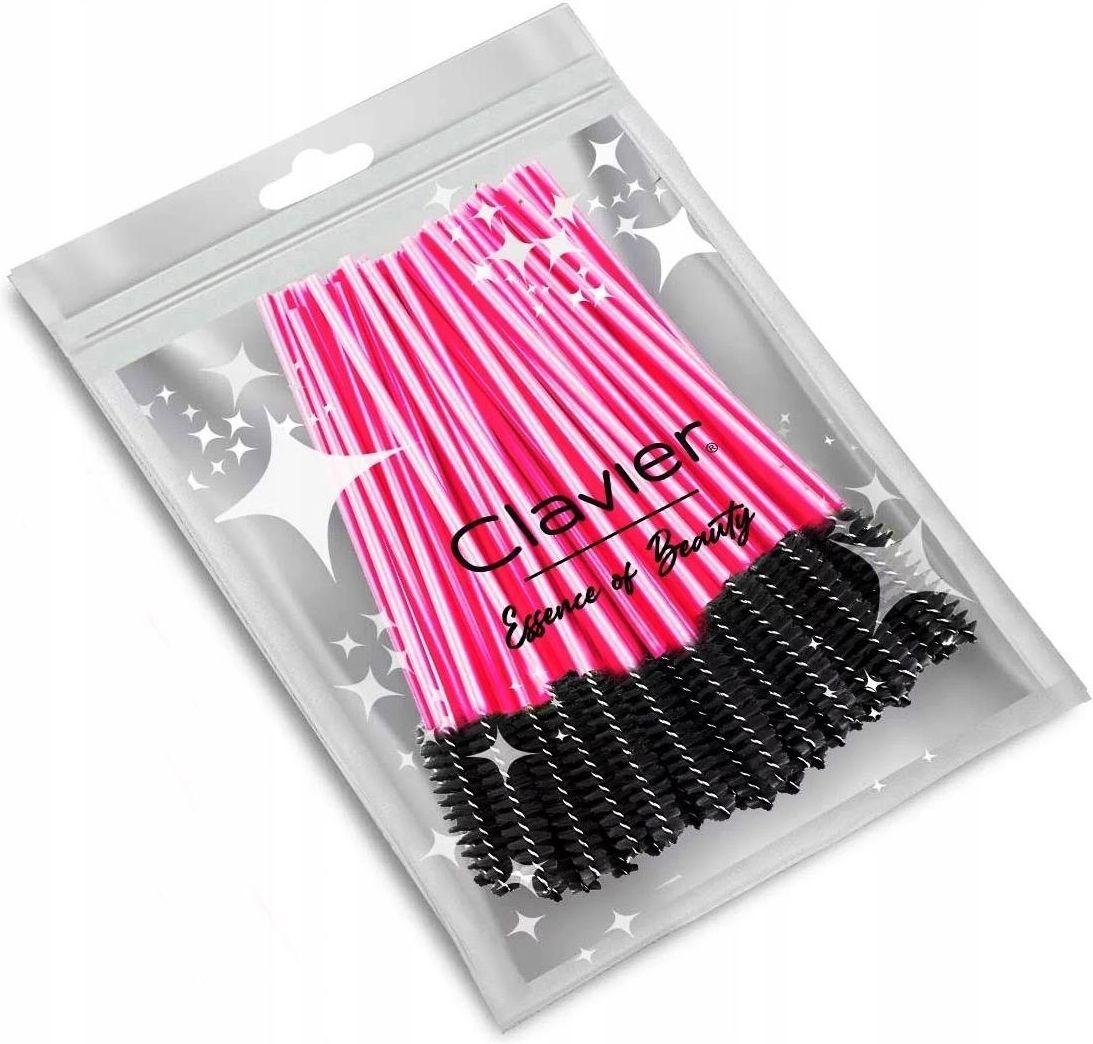 Eyelash Brushes marki Clavier. Szczoteczki do rzęs. Przeznaczone do jednorazowego użytku, dzięki czemu idealnie sprawdzą się w zakładach kosmetycznych, salonach oraz w pracy indywidualnej makijażystów i wizażystów. Zapewnią sprawną i higieniczną aplikację tuszu do rzęs, a także profesjonalnie rozdzielą i rozczeszą włoski. Zestaw składa się z 50 sztuk, jednorazowych szczoteczek wykonanych z syntetycznego materiału, ułożonego w kształt spiralki, która spektakularnie podkręca i optycznie dodaje włoskom objętości. Posiadają rączkę w odcieniu jasnego różu, który pięknie prezentuje się ze szczoteczką w kolorze czerni.Zestaw 50 szczoteczek.Są jednorazowe i higieniczne.Idealne dla salonów kosmetycznych.Nie niszczą i nie uszkadzają naturalnych włosków.