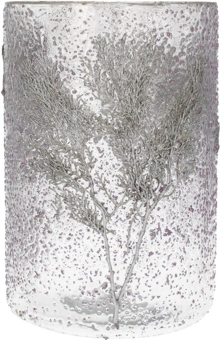 Świecznik szklany zdobiony srebrnymi gałązkami. Świecznik świąteczny ze szkła w otoczeniu srebrnych gałązek brokatowych to efektowna ozdoba, która wnosi do wnętrza wyjątkowy urok i magiczną atmosferę świąt. Jego delikatne półprzezroczyste szkło nadaje mu subtelności, a zarazem sprawia, że światło świecy, rozprasza się w sposób niezwykle uroczy i łagodny. Ozdobą świecznika są gałązki brokatowe. Te migoczące elementy dodają mu blasku i elegancji, a ich delikatny błysk przypomina nam o magicznej aurze świąt Bożego Narodzenia. Kiedy zapalasz świecę w świeczniku Twig, całe wnętrze wypełnia się ciepłem i blaskiem. Sprawdź nasze inne propozycje na świąteczne świeczniki!Wymiary: śr. 20 cm, wys. 30 cm.