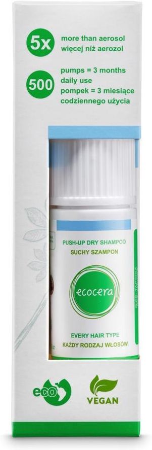 Wegański, suchy szampon w formie pudrowej mgiełki pochłania nadmiar sebum, pozostawiając włosy świeże i mocno uniesione u nasady. Dzięki wysokiemu współczynnikowi absorpcji skrobi ryżowej oraz tapioki, stanowiących podstawę formuły, kosmetyk pozwala szybko i długotrwale odświeżyć każdy rodzaj włosów. Zawarta w szamponie L-arginina posiada silne właściwości nawilżające, przyspieszające syntezę keratyny oraz stymulujące wzrost włosa. Kondycjoner nadaje włosom naturalny połysk i gładkość, zapobiega elektryzowaniu i puszeniu się włosów zwiększając jednocześnie efekt push-up. Szampon pozostawia subtelny, świeży zapach białej herbaty. Bezpieczny dla środowiska, nie zawiera aerozolu, alergenów ani sztucznych barwników. Sposób użycia: Mocno wstrząsnąć przed użyciem. Rozpylać na suche włosy krótkimi seriami z odległości ok. 15 cm. Po chwili wmasować, nadmiar wyczesać lub wytrzeć ręcznikiem. Można stosować miejscowo na wybrane pasma, aby zwiększyć objętość, ułatwić stylizację i przedłużyć jej efekt. Przechowywać w suchym miejscu. ECOCERA SUCHY SZAMPON DO WŁOSÓW KAŻDEGO RODZAJU ECOCERA SUCHY SZAMPON DO WŁOSÓW ŁAMLIWYCH I KRUCHYCH ECOCERA SUCHY SZAMPON DO WŁOSÓW PRZETŁUSZCZAJĄCYCH SIĘ ECOCERA SUCHY SZAMPON DO WŁOSÓW CIEMNYCH