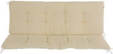 Komplet poduszek Girona na huśtawki/ławkę składa się z dwóch poduszek. Zarówno wierzch, jak i spód poduszek obleczony został poliestrowo-bawełnianą tkaniną. Ich wypełnienie to włóknina poliestrowa 600gr. Każda z poduszek posiada troczki do mocowania do huśtawki. Poduszki posiadają pikowania w ośmiu miejscach. Dane techniczne Marka: Patio. Kolekcja: Girona. Długość [cm]: 158. Szerokość [cm]: 110. Waga [kg]: 1.578. Ilość osób: 3. Materiał: Bawełna, Poliester. Skład materiałowy: 52% poliester, 48% bawełna. Kolor: beżowy. Wzór: pasy.