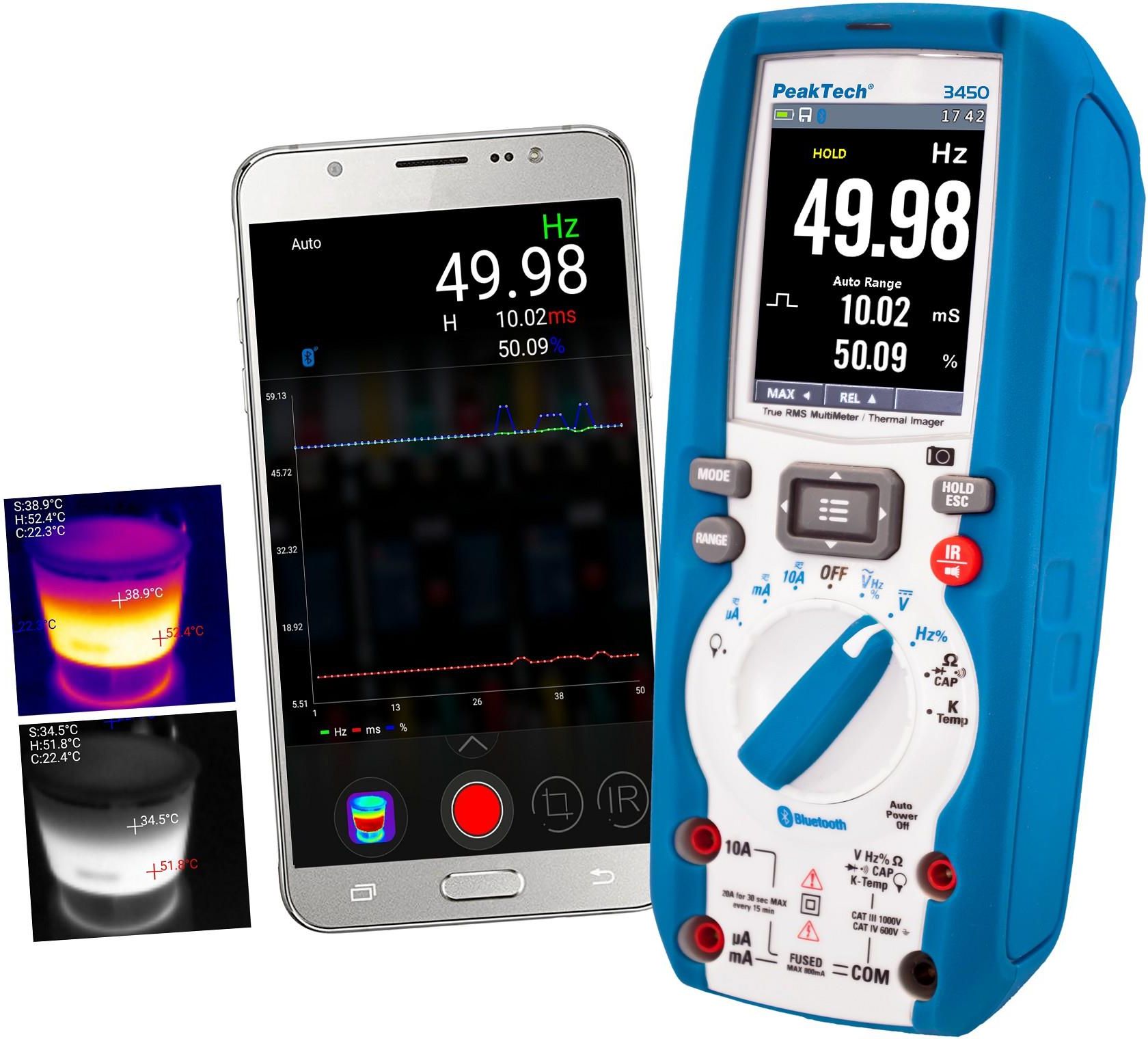 Witamy na aukcji oficjalnego dystrybutora marki PeakTech w Polsce. PEAK3450; Multimetr cyfrowy BT RMS DATA 10A PeakTech 3450 Multimetr graficzny True RMS 1000V z Data Logger, Bluetooth 4.0 i termowizją To nowe połączenie najnowszego multimetru graficznego True RMS i czułej kamery termowizyjnej …