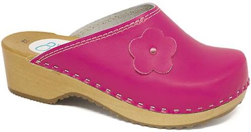 chodaki dziecięce, wyprofilowane ortopedycznie, drewno topola +guma antypoślizgowa , skóra bydlęca kolor róż + ozdobny kwiatek.