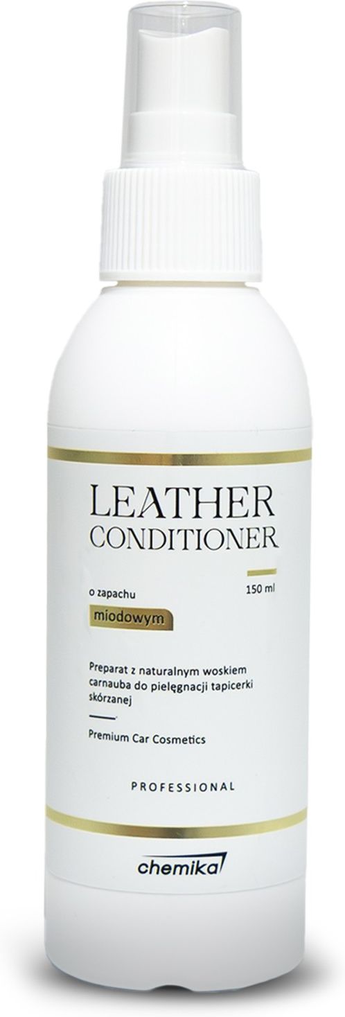 CHEMIKA LEATHER CONDITIONER 150ml CHEMIKA Leather Conditioner to preparat do skóry samochodowej, którego celem jest wydłużenie żywotności skóry i zabezpieczenie jej. Produkt w połączeniu z woskiem carnauba tworzy na powierzchni powłokę przeciw wszelkiego rodzaju brudu i wilgoci o miodowym zapachu. Zabezpiecza skórę Preparat do pielęgnacji skóry w samochodzie Leather Conditioner nie służy wyłącznie do pielęgnacji skóry w samochodzie, ale również do jej zabezpieczenia. Preparat zabezpiecza powierzchnię przed wysychaniem i pękaniem, a filtry UV zapobiegają blaknięciu. Przywraca dawny stan Nasz preparat do pielęgnacji skóry samochodowej przywraca jej naturalny kolor, regeneruje powierzchnię i wypełnia drobne rysy, nadając jej dawny wygląd oraz ułatwiając dalszą pielęgnację. Wszechstronność działania Środek do pielęgnacji skóry CHEMIKA sprawdza się również w przypadku skóry meblowej, zapewniając jej ochronę i regenerację, podobnie jak w przypadku tapicerki samochodowej. Sposób użycia Przed użyciem wstrząsnąć Zaleca się przed użyciem sprawdzić oddziaływanie na impregnowaną powierzchnię w mało widocznym miejscu. Nanosić preparat zawsze na suchą i czystą powierzchnię Rozpylić cienką warstwę środka i rozprowadzić preparat na impregnowanej powierzchni Pozostawić do wyschnięcia Konserwacje powinno się przeprowadzać co 3 – 6 miesięcy. Kup CHEMIKA Leather Conditioner i zadbaj o skóre w swoim samochodzie jak profesjonalista! Kup CHEMIKA Leather Conditioner i zadbaj o skóre w swoim samochodzie jak profesjonalista! CHEMIKA LEATHER CONDITIONER stosuję się w celu wydłużenia żywotności skór gładkich. Środek ten w połączeniu z woskiem carnauba tworzy na powierzchni innowacyjną powłokę bezwzględną dla wszelkiego rodzaju zabrudzeń i wilgoci. Zabezpiecza skórę przed wysychaniem i pękaniem, a filtry UV zapobiegają blaknięciu.